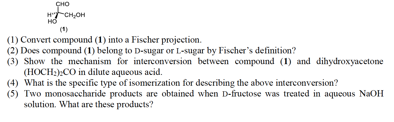 CHO H' CH2OH HO (1) (1) Convert compound (1) into a Fischer pr...