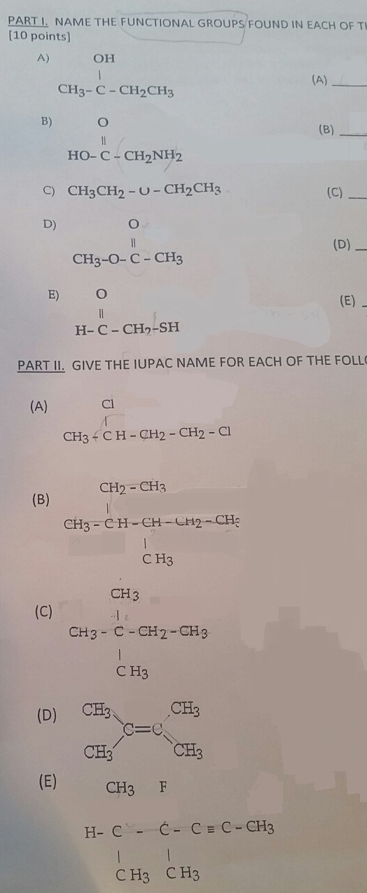 PART I: NAME THE FUNCTIONAL GROUPS/FOUND IN EACH OFT 10 points) ...
