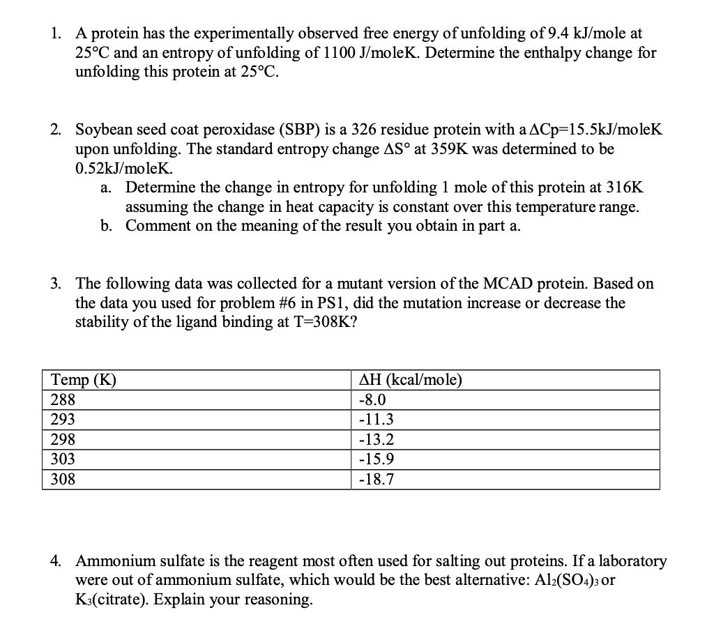 1. A protein has the experimentally observed free energy of unfoldi...