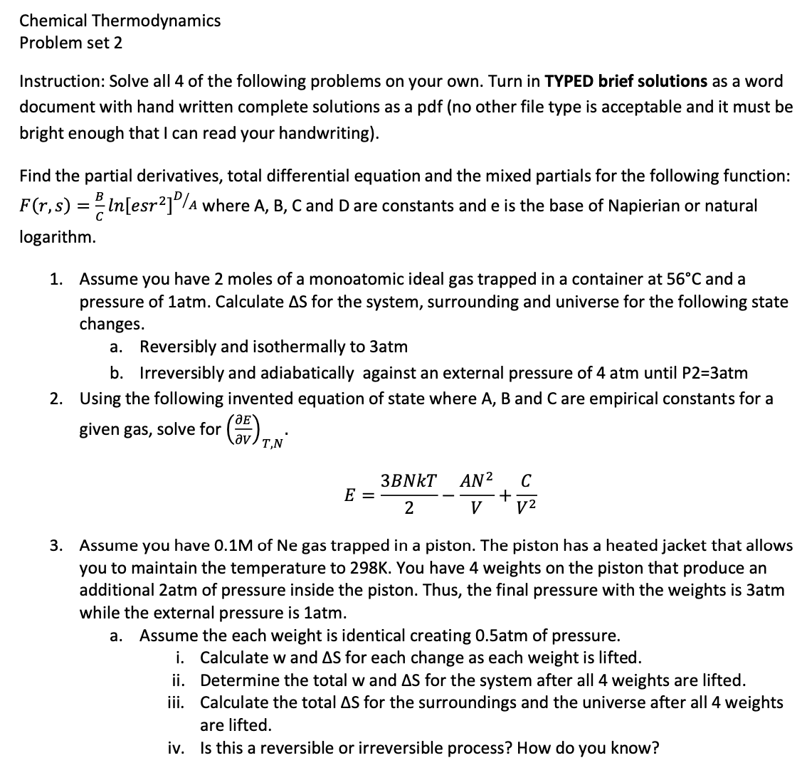 Chemical Thermodynamics Problem set 2 Instruction: Solve all 4 of ...