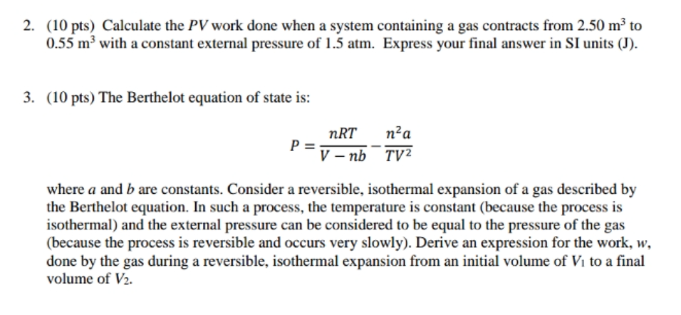 2. (10 pts) Calculate the PV work done when a system containing a g...