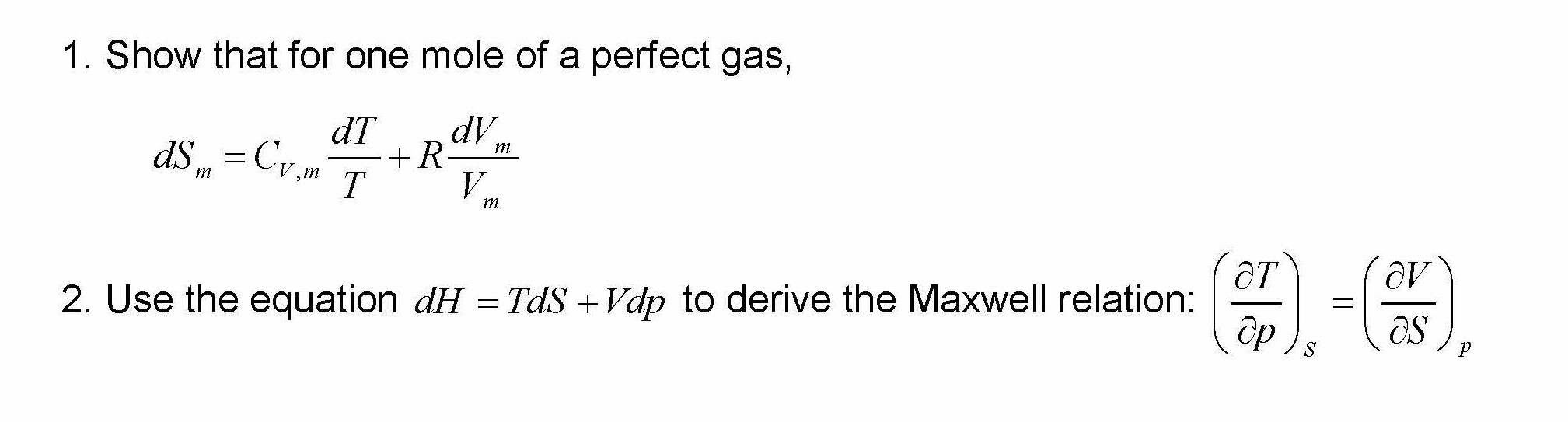 1. Show that for one mole of a perfect gas, dSm =CV,m dT +RdVm T V...