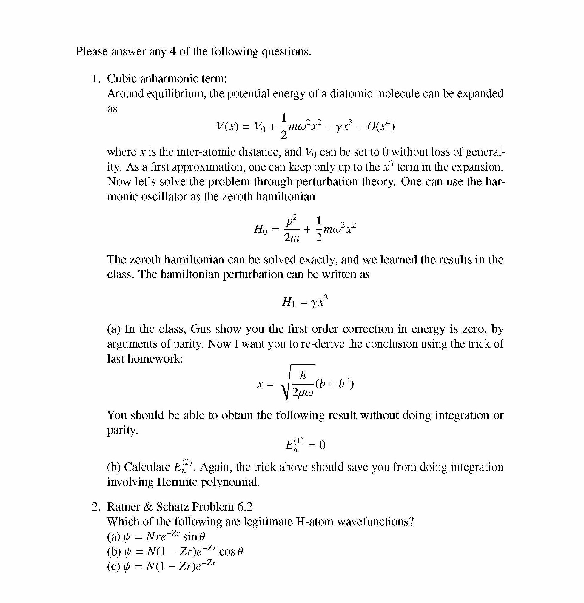 Please answer any 4 of the following questions. 1. Cubic anharmoni...