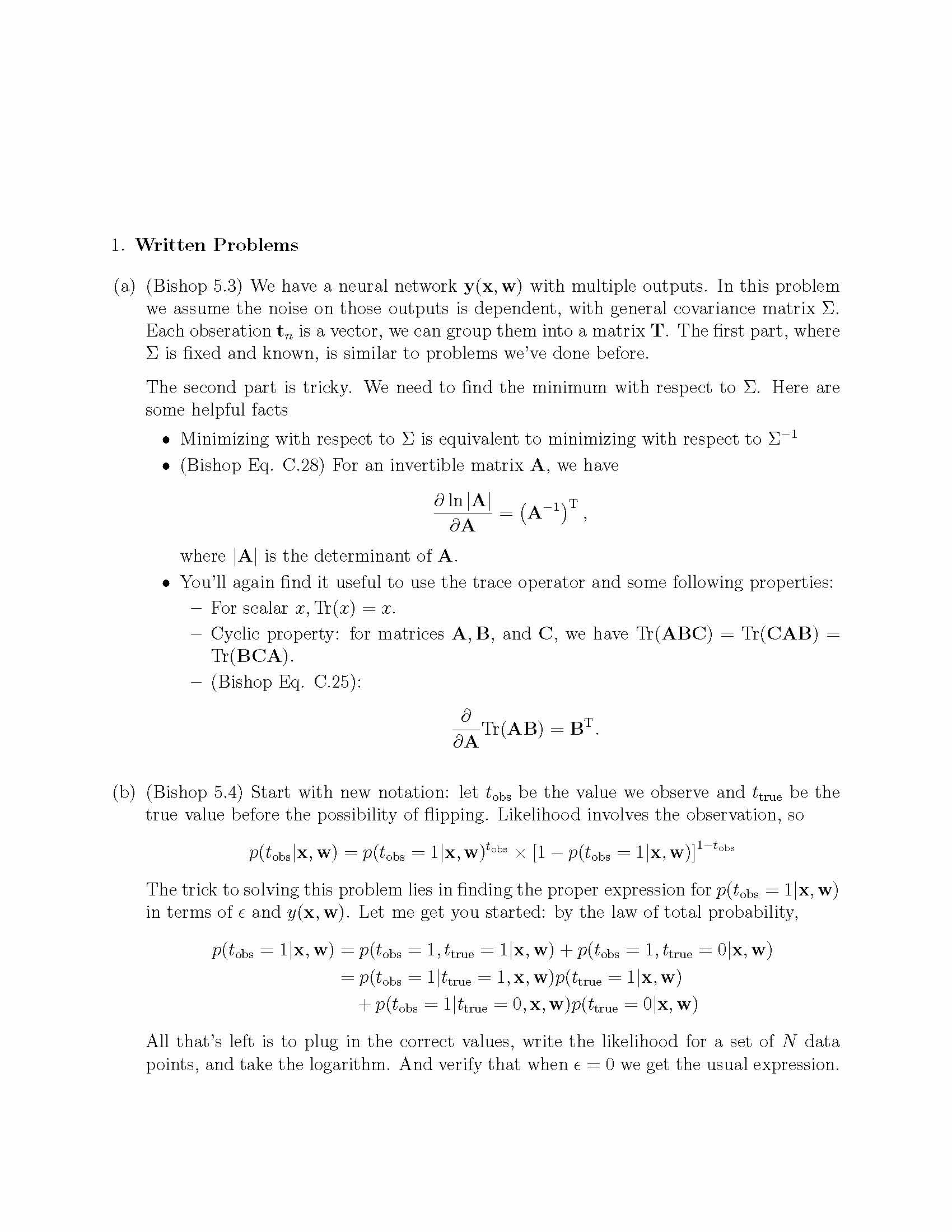 1. Written Problems (a) (Bishop 5.3) We have a neural network y(x;...