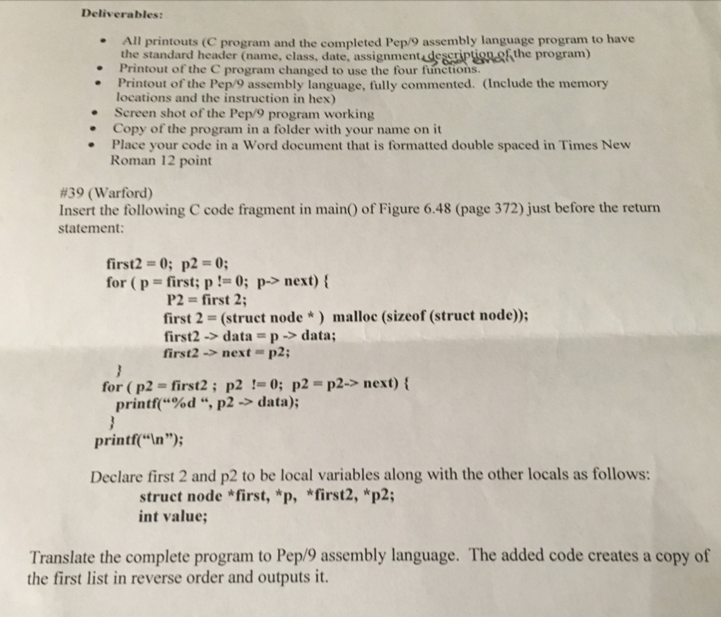 Deliverables: All printouts (C program and the completed Pep/9 ass...
