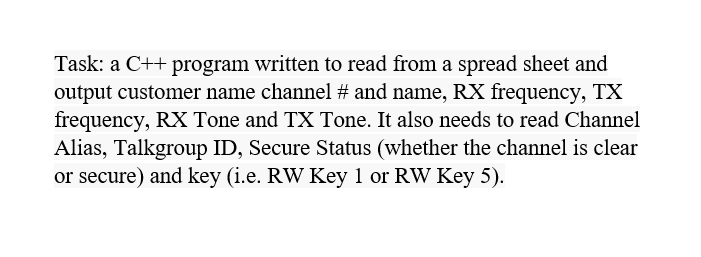 Task: a C++ program written to read from a spread sheet and output...