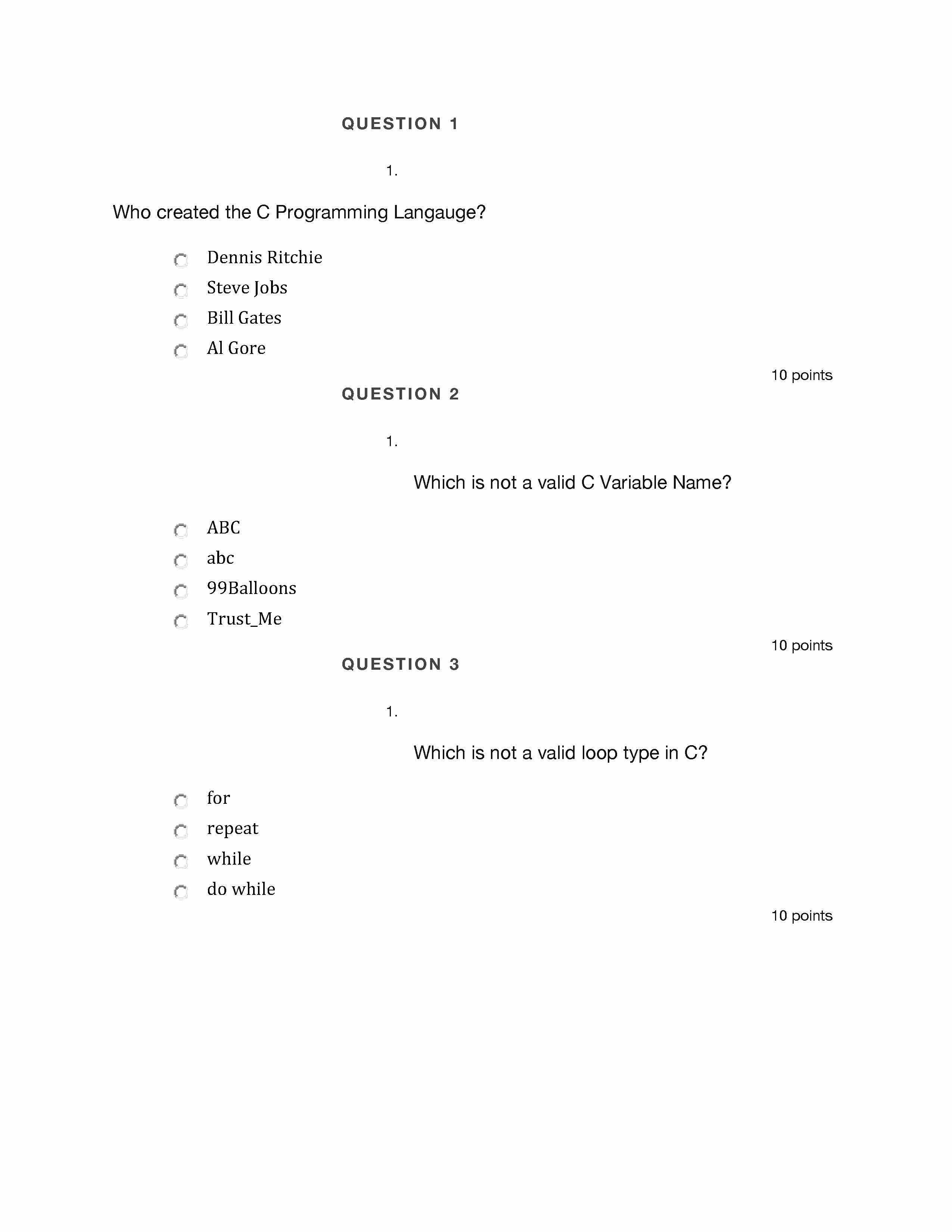 QUESTION 1 Who created the C Programming Langauge? Dennis Ritchic...