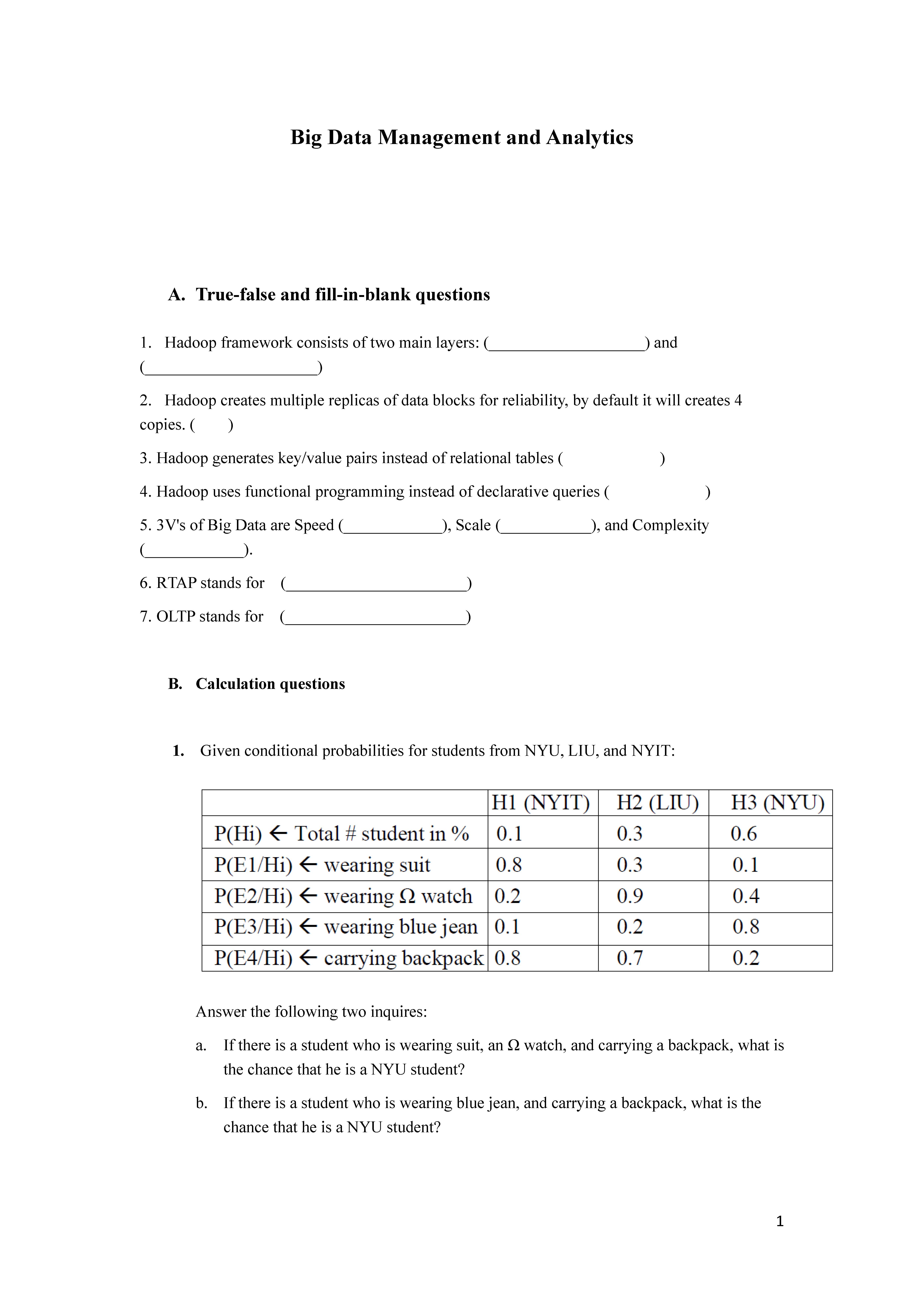 Big Data Management and Analytics A. True-false and fill-in-blank...
