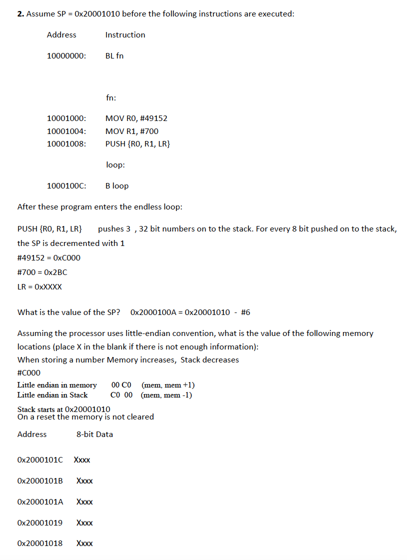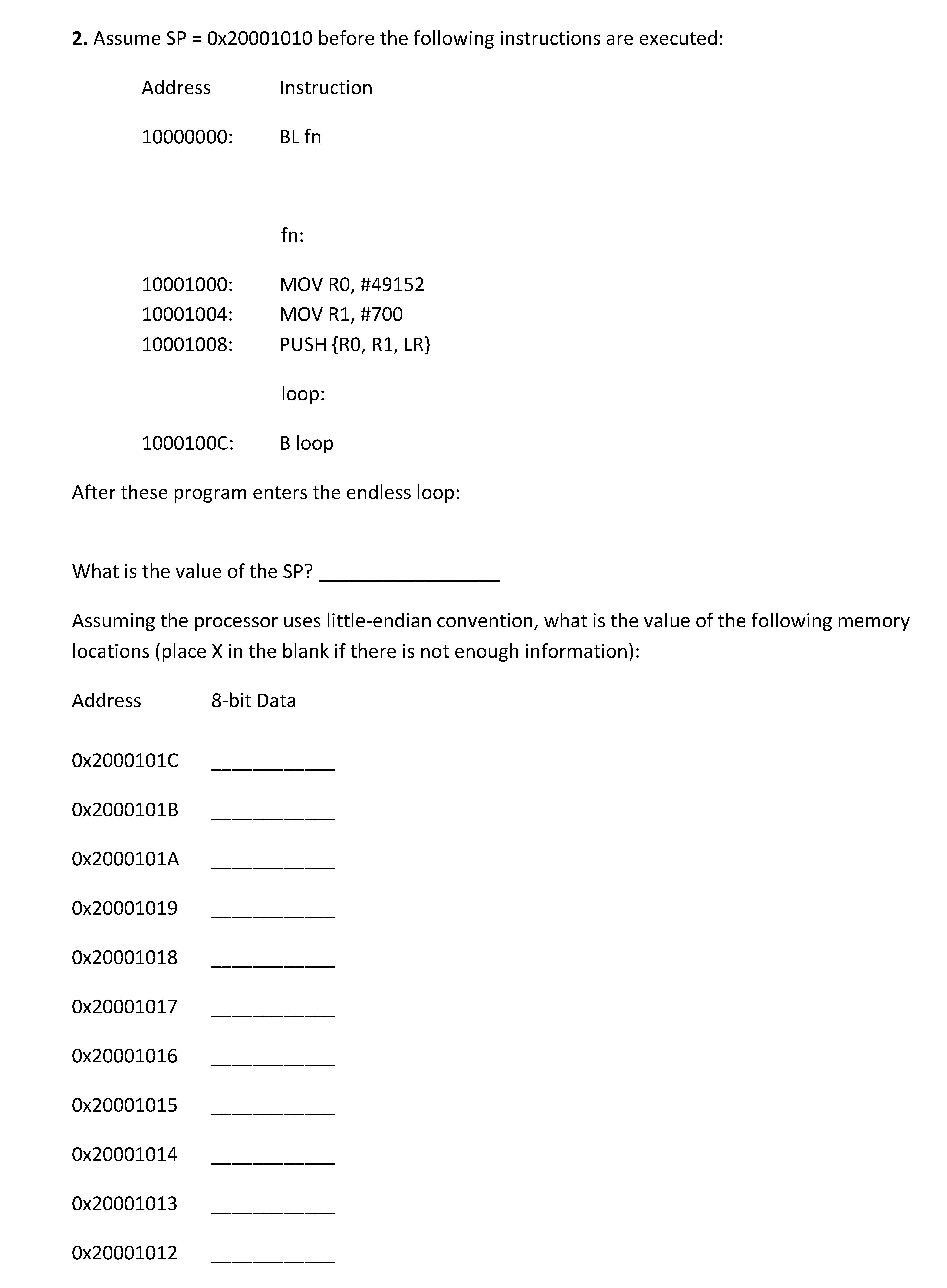 2. Assume SP = 0x20001010 before the following instructions are exe...