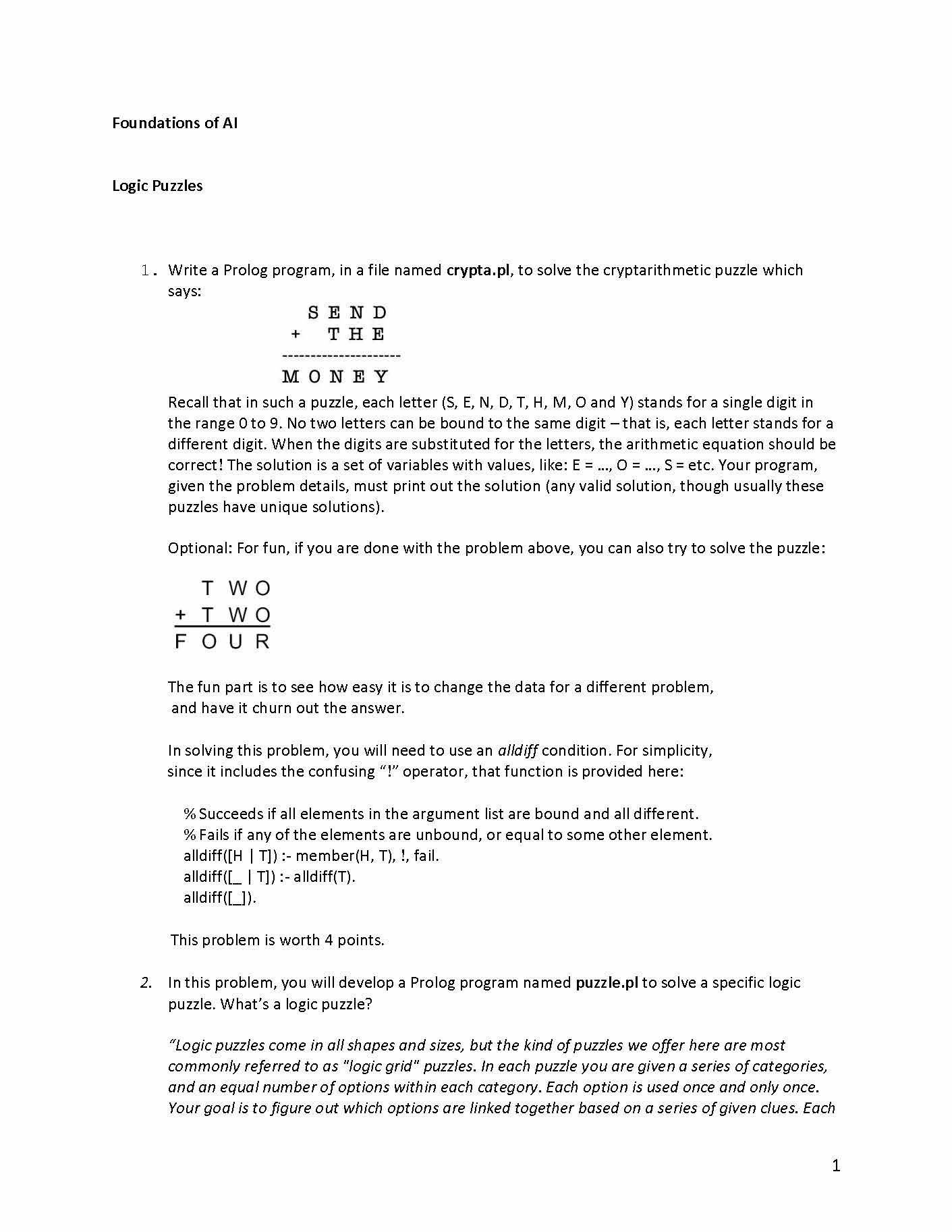 Foundations of AI Logic Puzzles 1. Write a Prolog program, in a f...