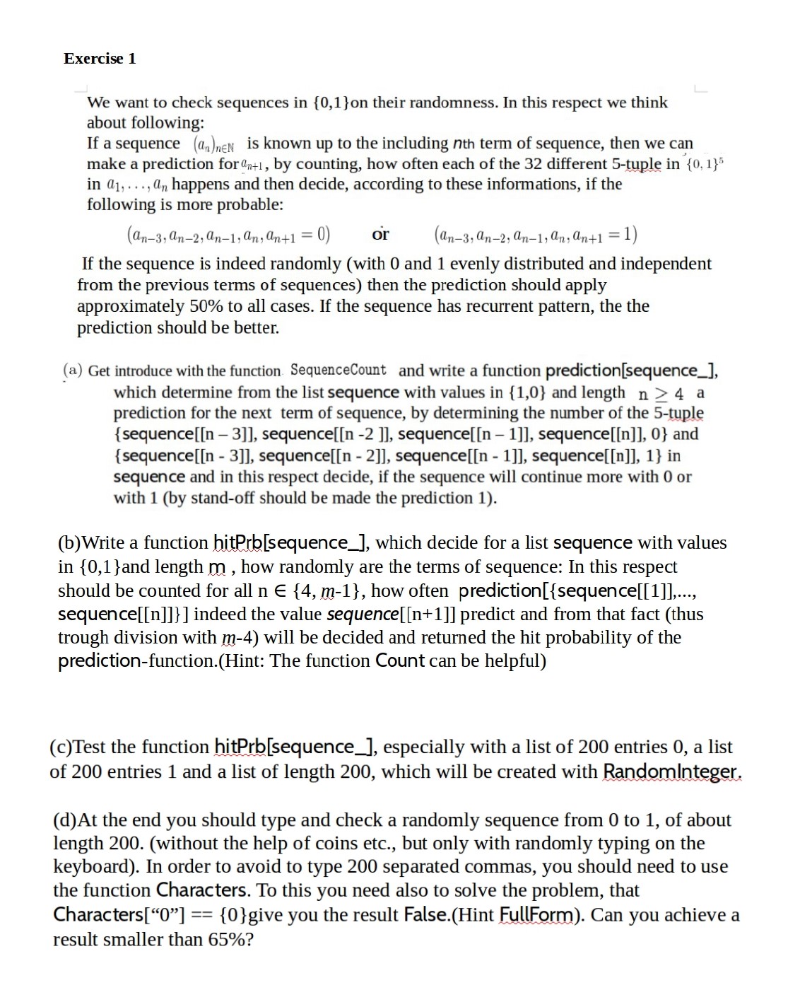 Exercise 1 We want to check sequences in {0,1}on their randomness....