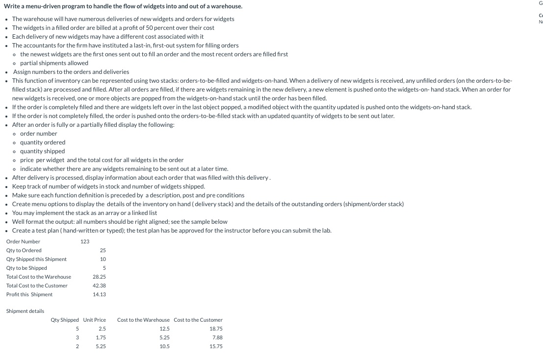 Write a menu-driven program to handle the flow of widgets into and ...