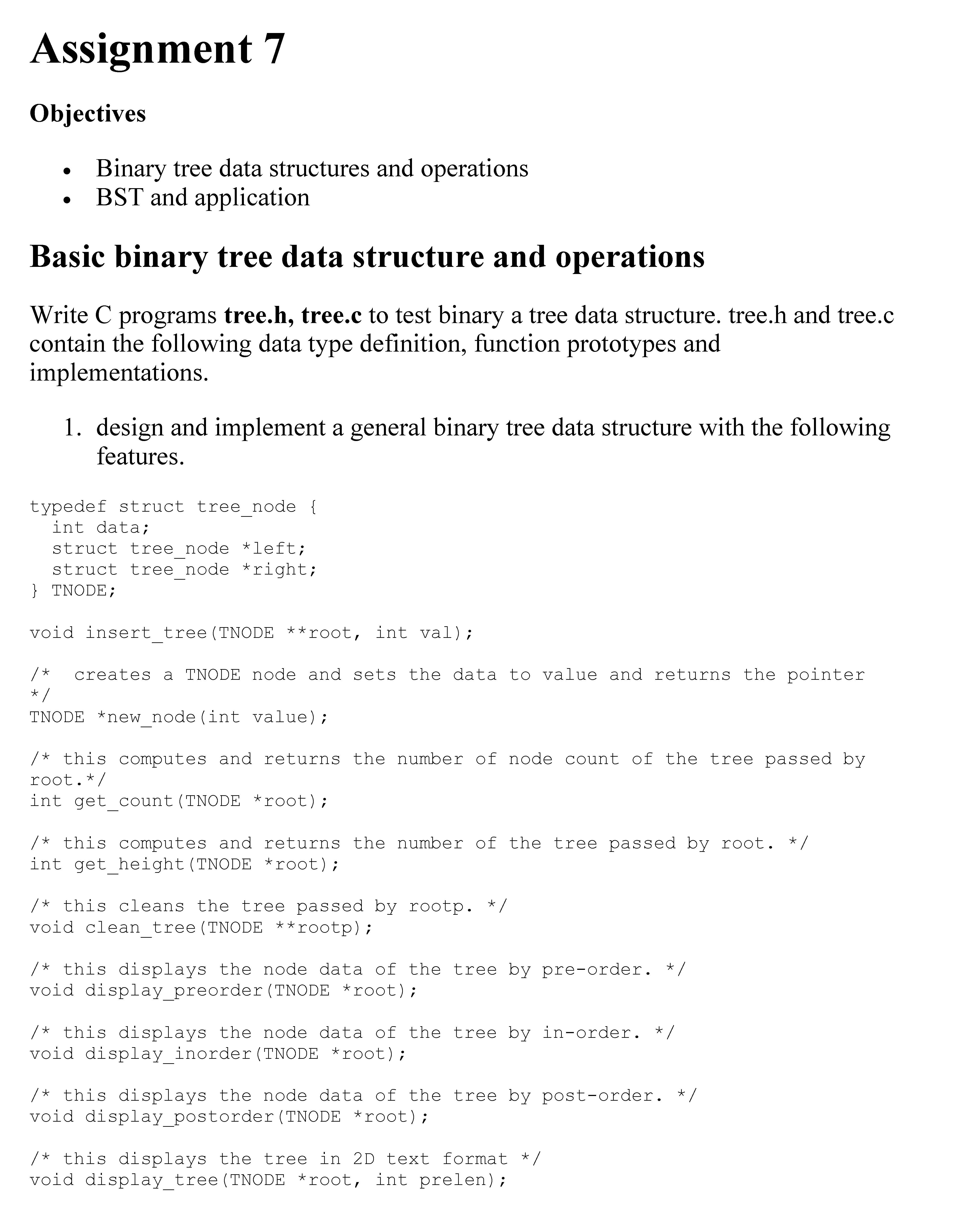 Assignment 7 Objectives • Binary tree data structures and opera...