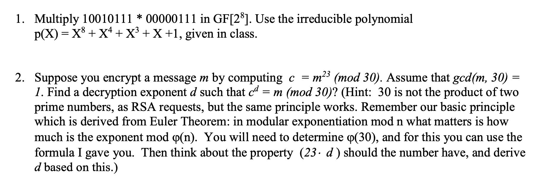 1. Multiply 10010111 00000111 in GF[28] Use the irreducible polynom...