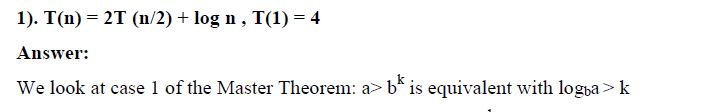 1). T(n) = 2T (n/2) + log n , T(1) = 4 2). T(n) = 2T (n/2) + n log...