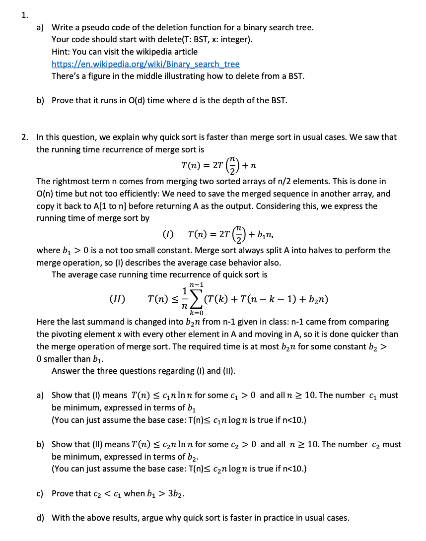 1. a) Write a pseudo code of the deletion function for a binary se...
