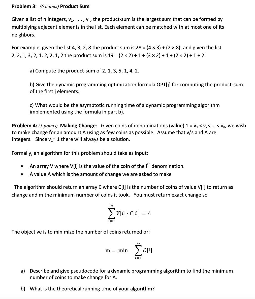 Problem 3: (6 points) Product Sum Given a list of n integers, V1...