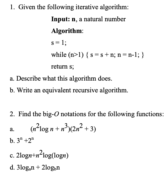 1. Given the following iterative algorithm: Input: n, a natural nu...