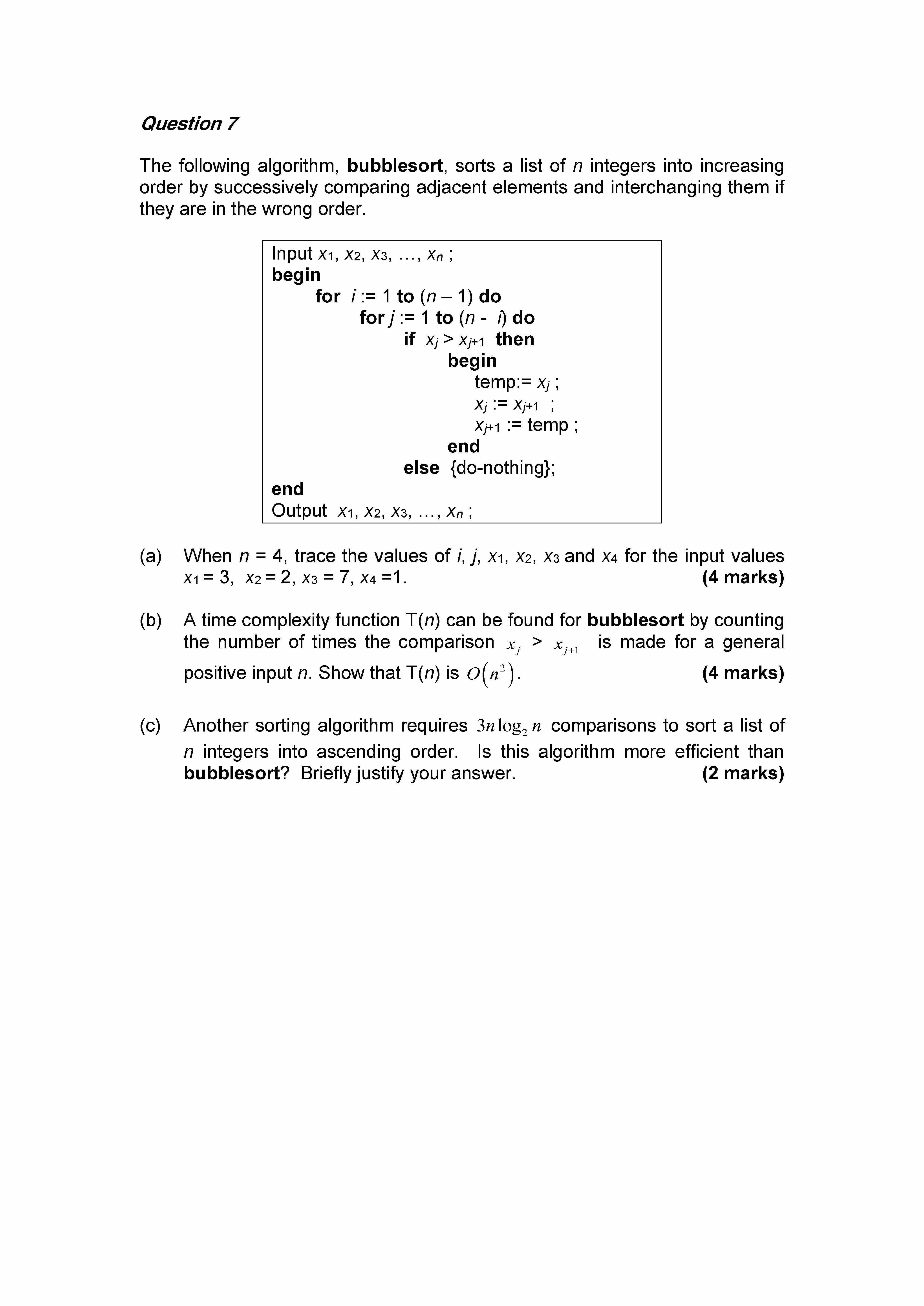 The following algorithm, bubblesort, sorts a list of n integers int...