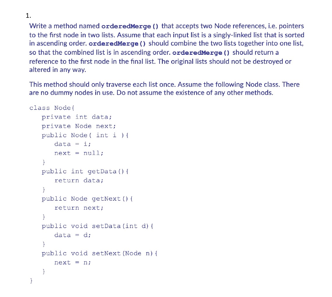 1. Write a method named orderedMerge () that accepts two Node refe...