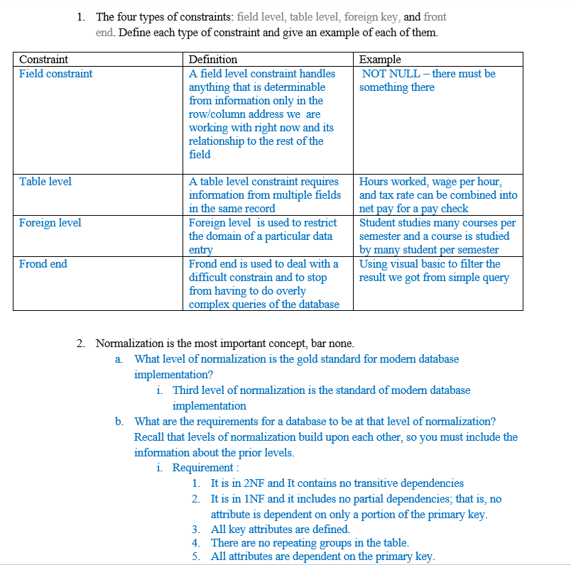 1) The four types of constraints: field level, table level, foreign...