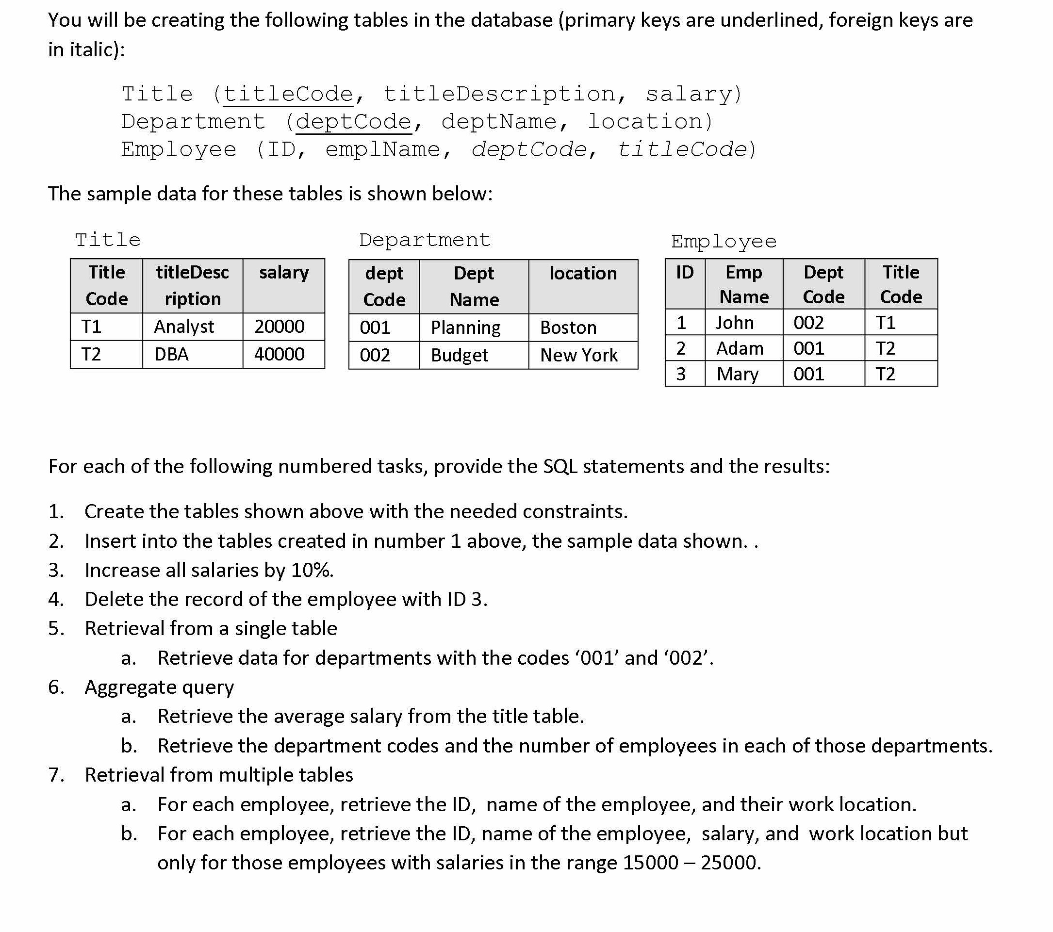 You will be creating the following tables in the database (primary...