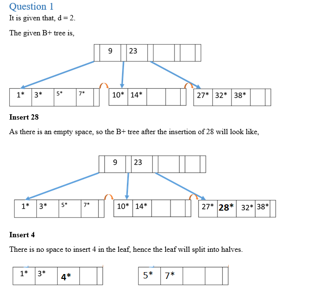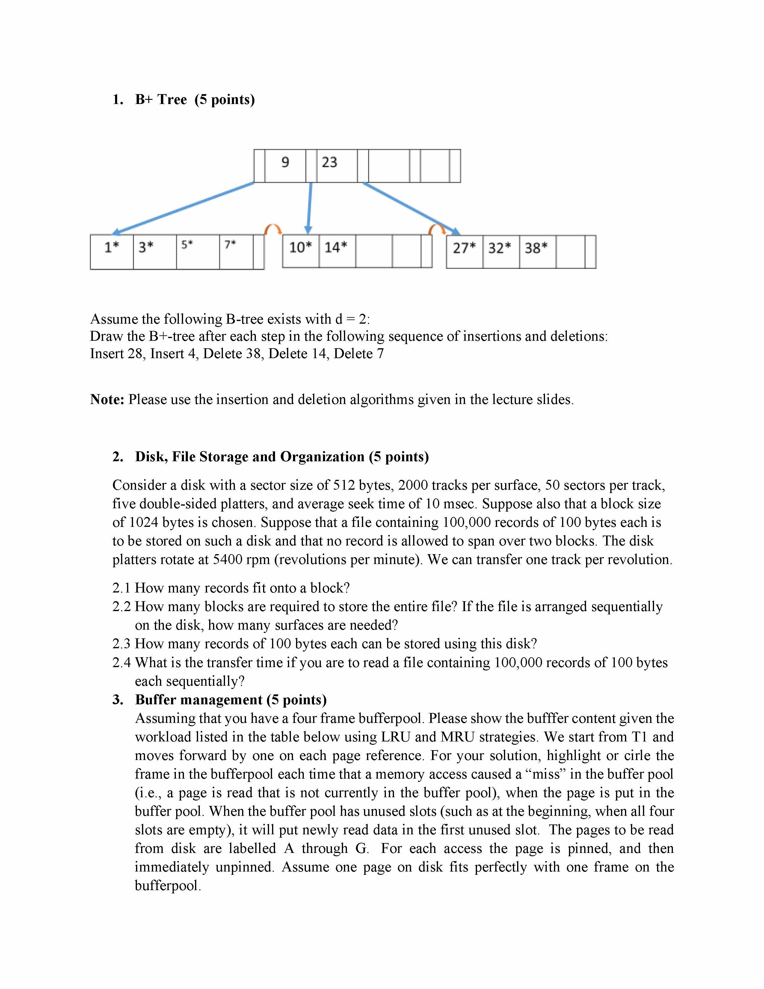 1. B+ Tree (5 points) Assume the following B-tree exists with d = ...