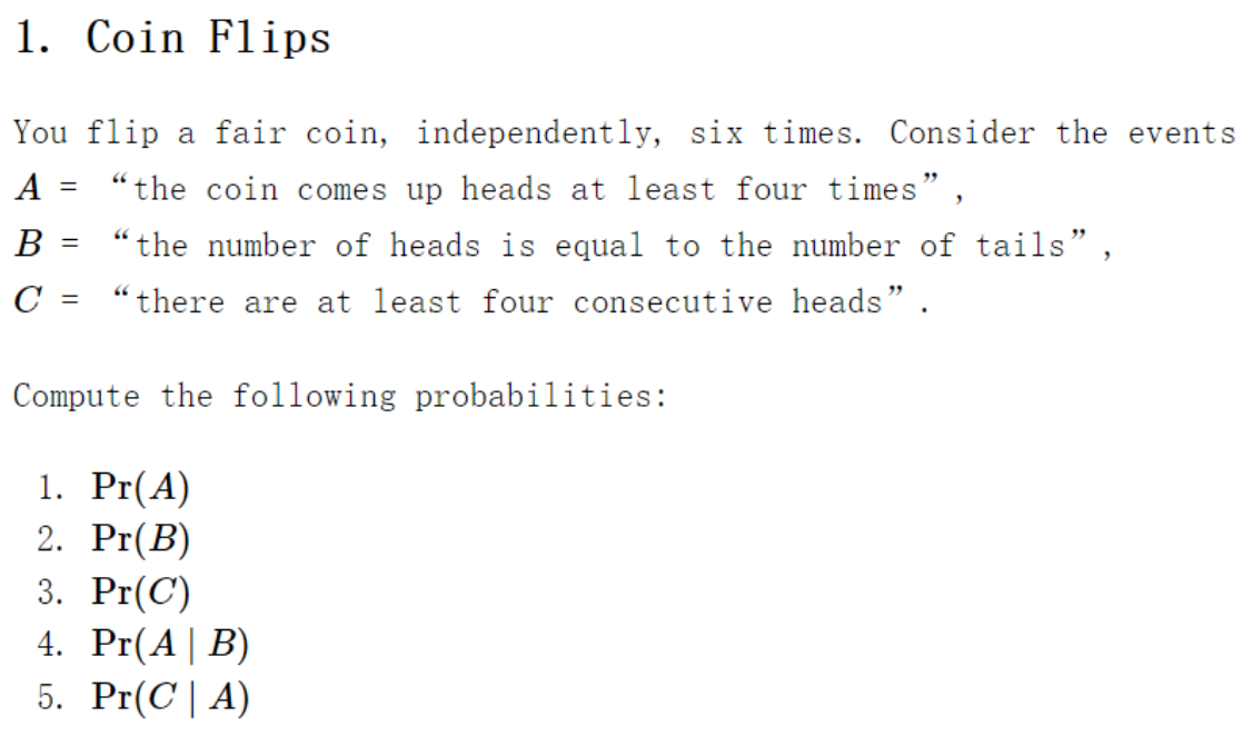 1. Coin Flips You flip a fair coin, independently, six times. Cons...