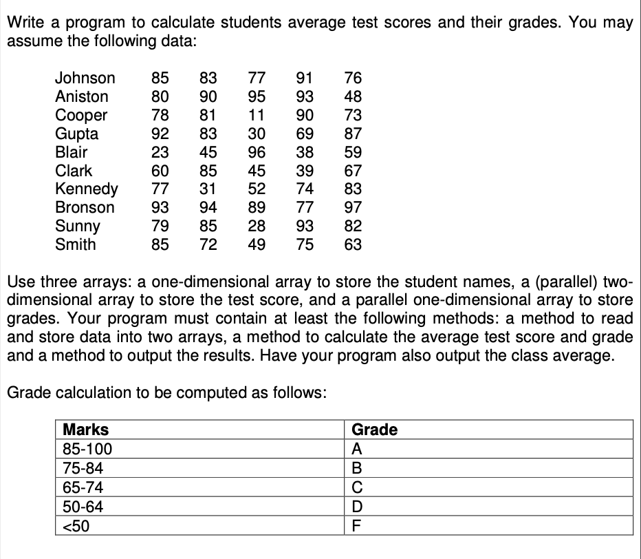 Write a program to calculate students average test scores and their...
