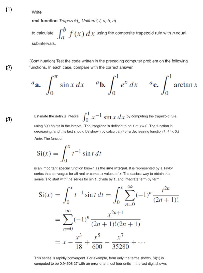 (1) Write real functionTrapezoid_Uniform(f,a,bn) to calculate (&...