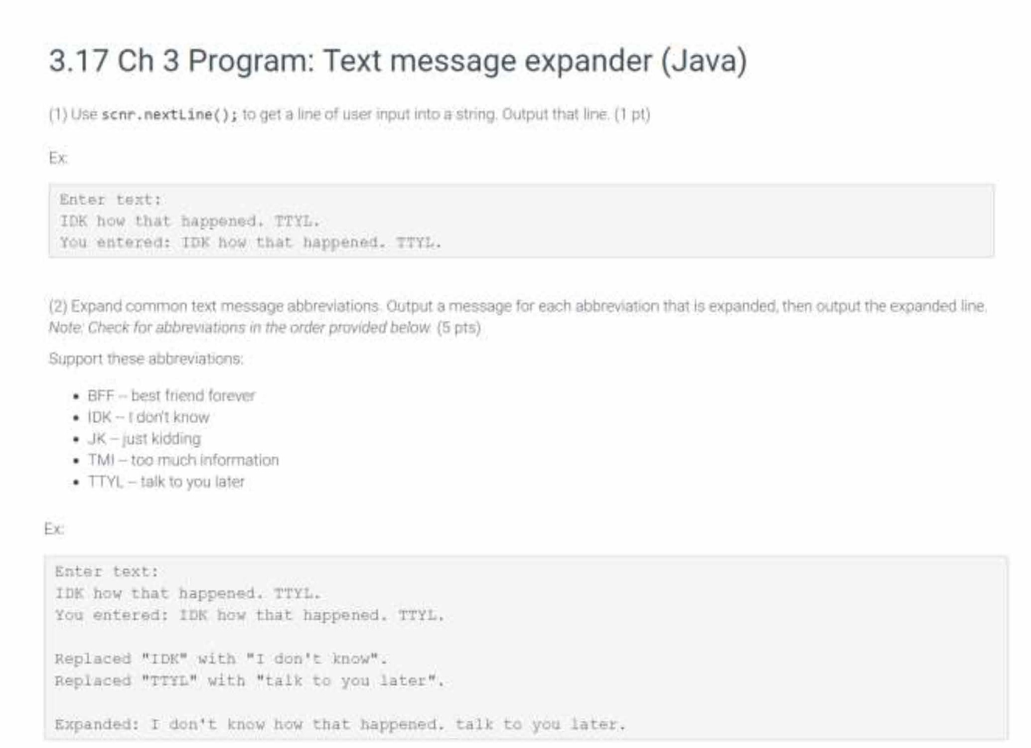 3.17 Ch 3 Program: Text message expander (Java) (1) Use scnr.nextL...