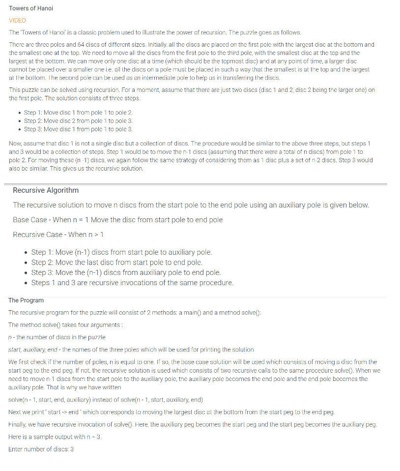 Towers of Hanoi VIDEO The 'Towers of Hanoi is a classic problem u...