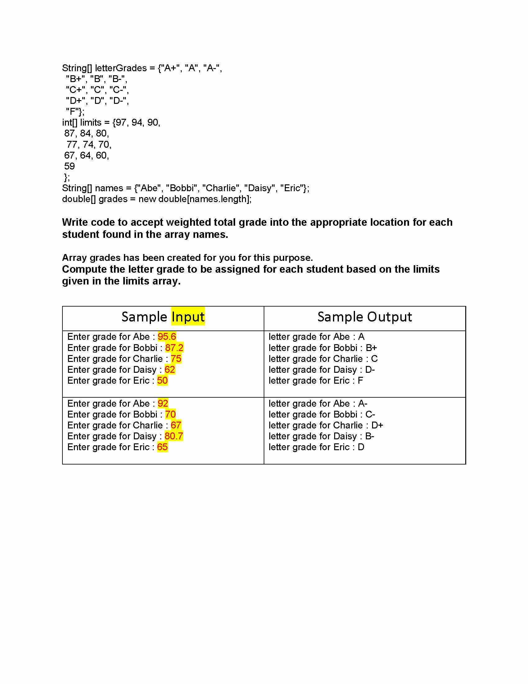 String[] letterGrades = {"A+", "A", "A-&qu...