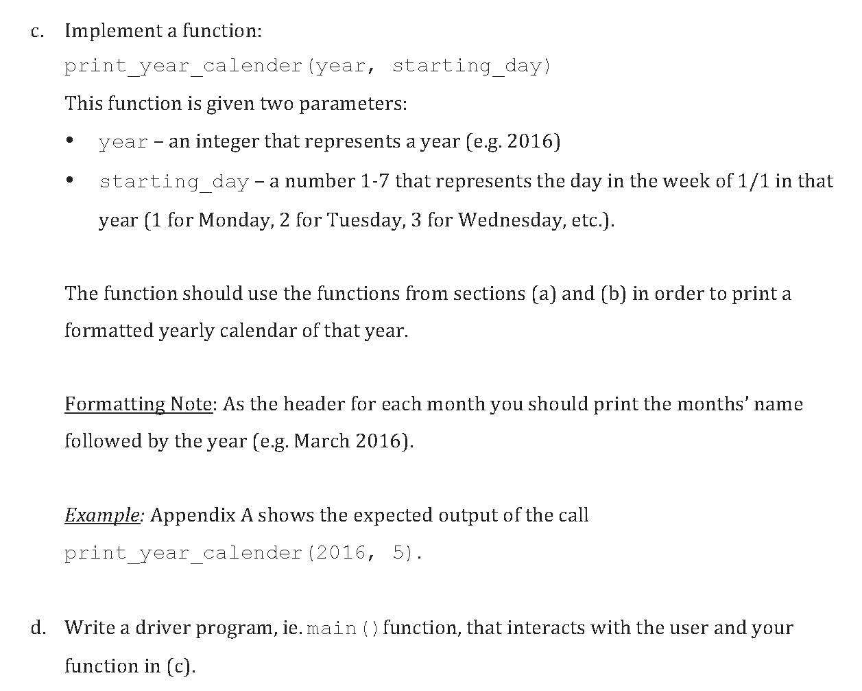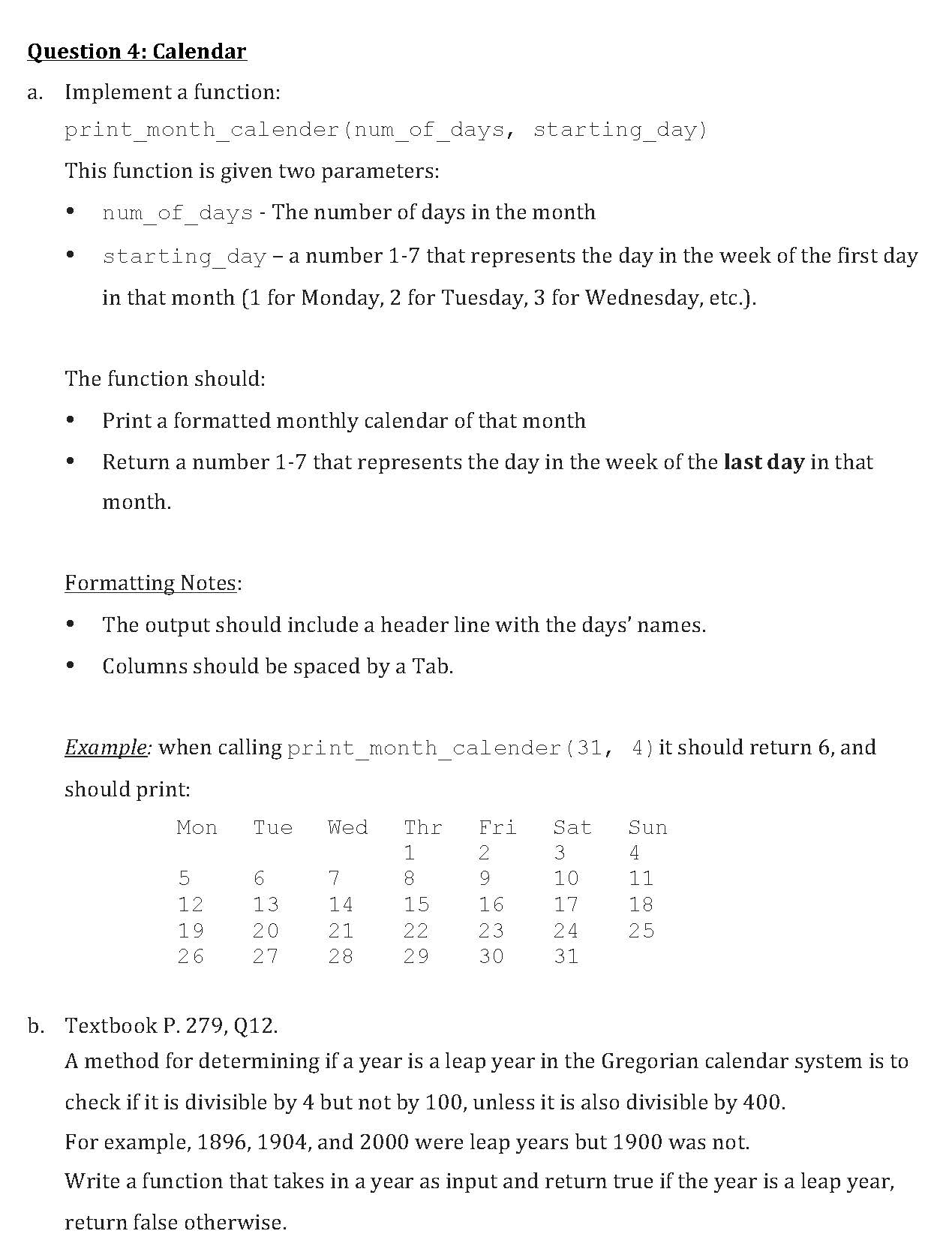 Question 4: Calendar a. Implement a function: print_month_calende...