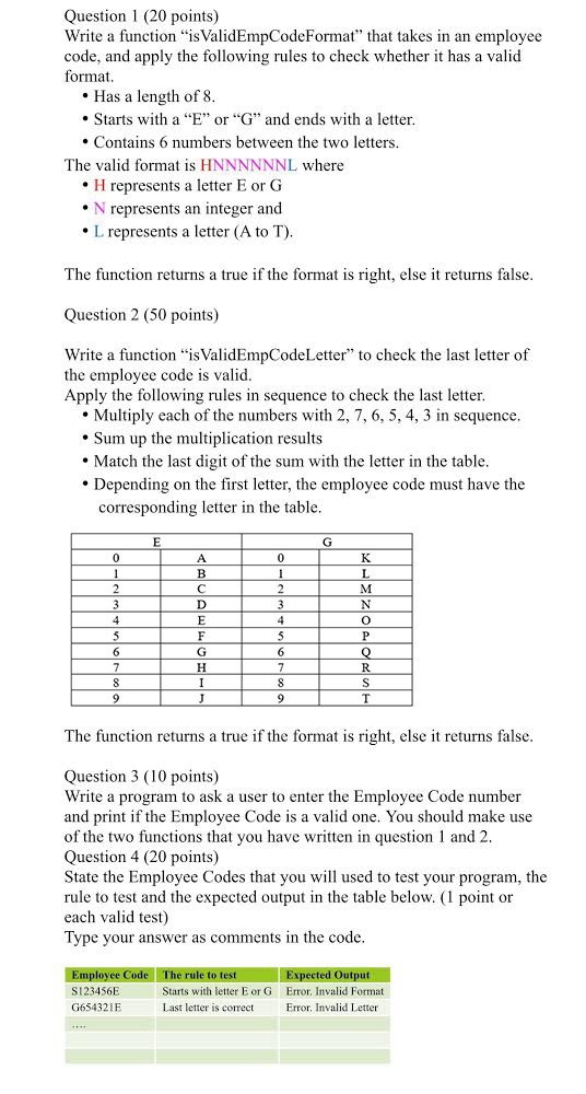 Question 1 (20 points) Write a function "isValidEmpCodeFormat...