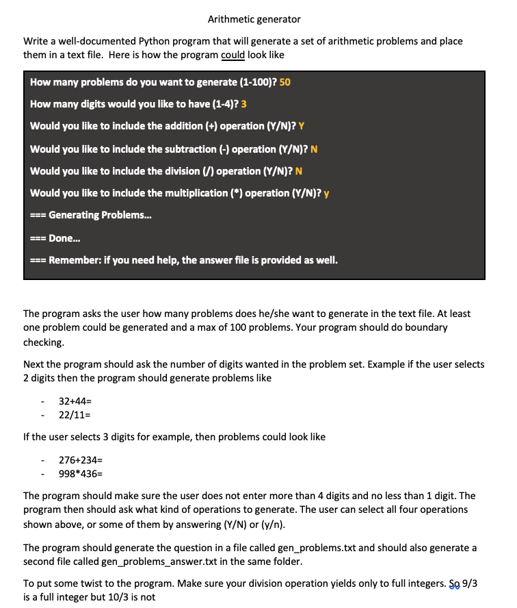 Arithmetic generator Write a well-documented Python program that w...
