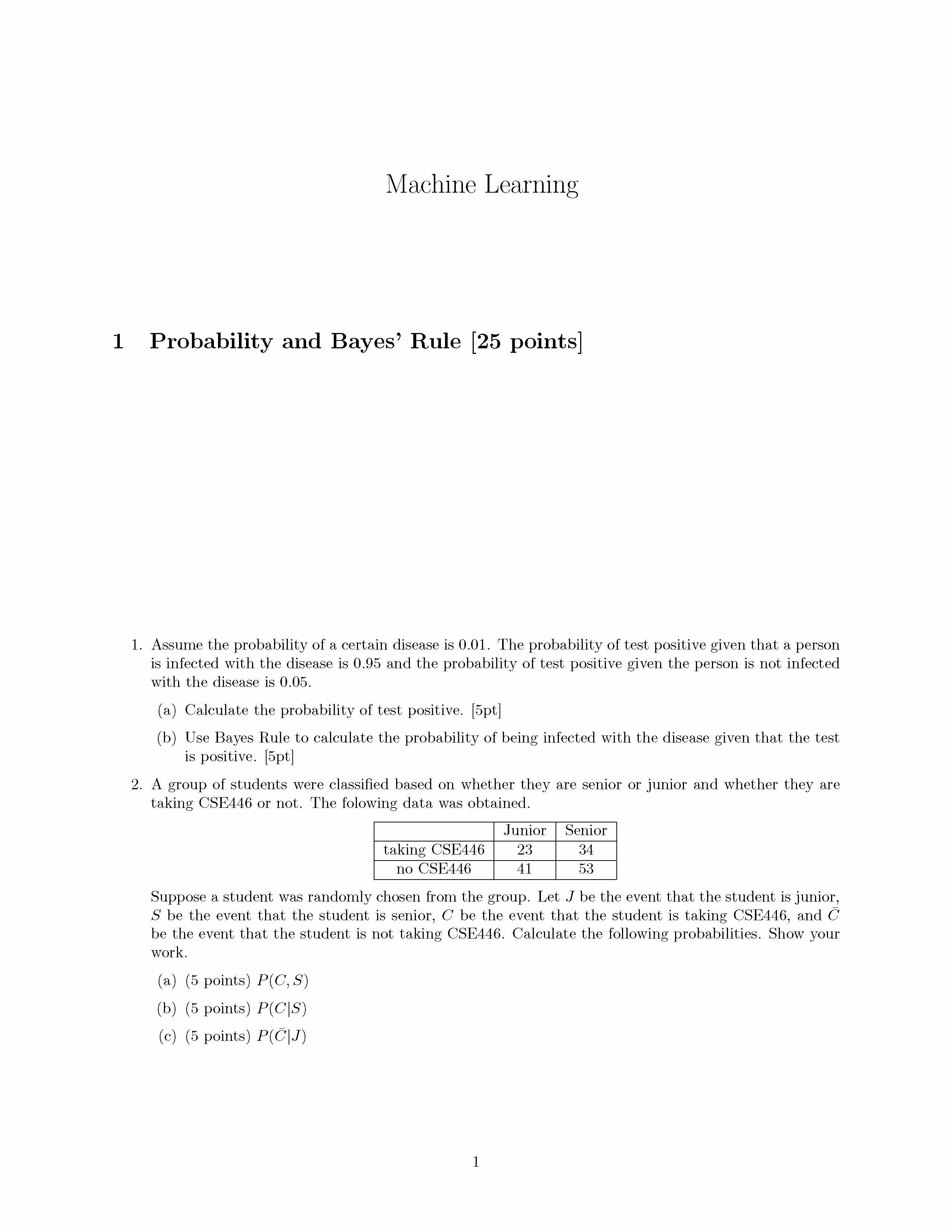 Machine Learning 1 Probability and Bayes’ Rule [25 points] 1. A...