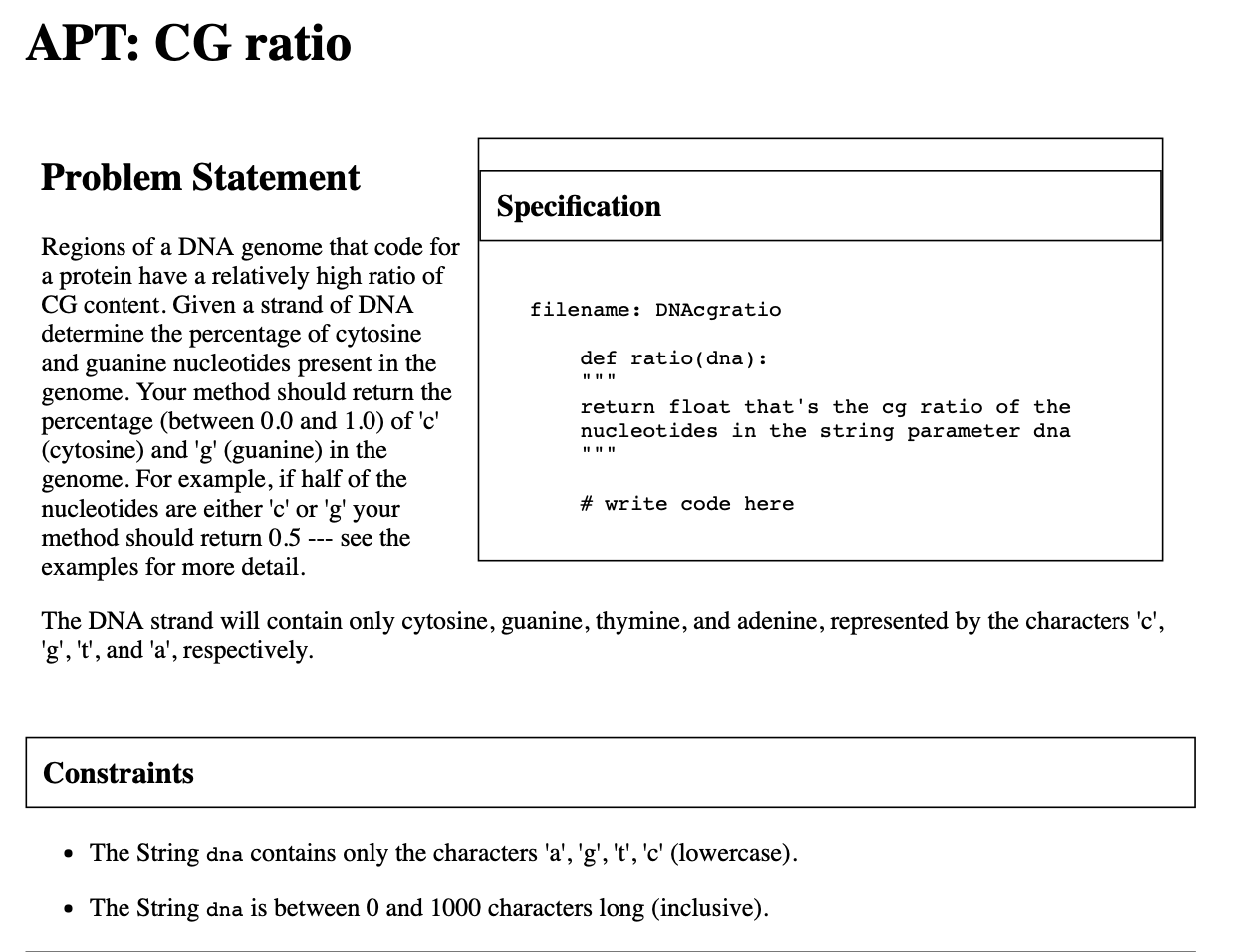 APT: CG ratio Problem Statement Specification Regions of a DNA g...