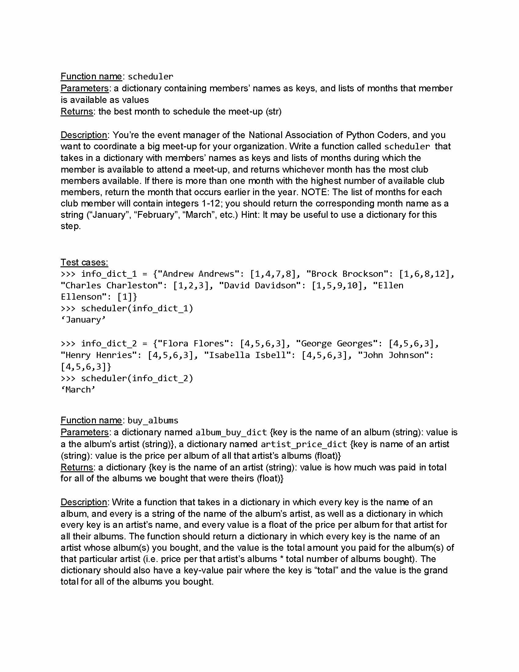 Function name: scheduler Parameters: a dictionary containing membe...