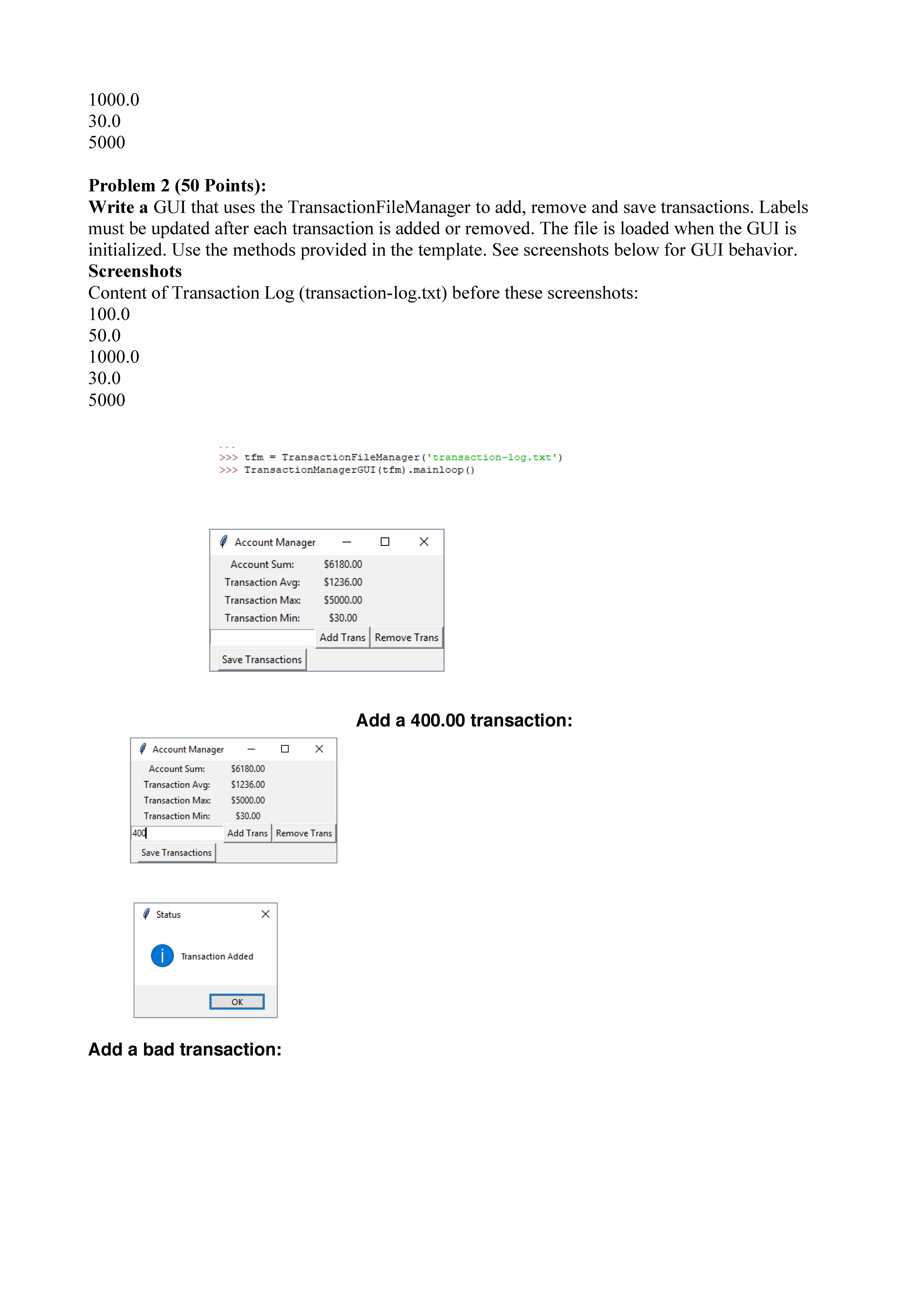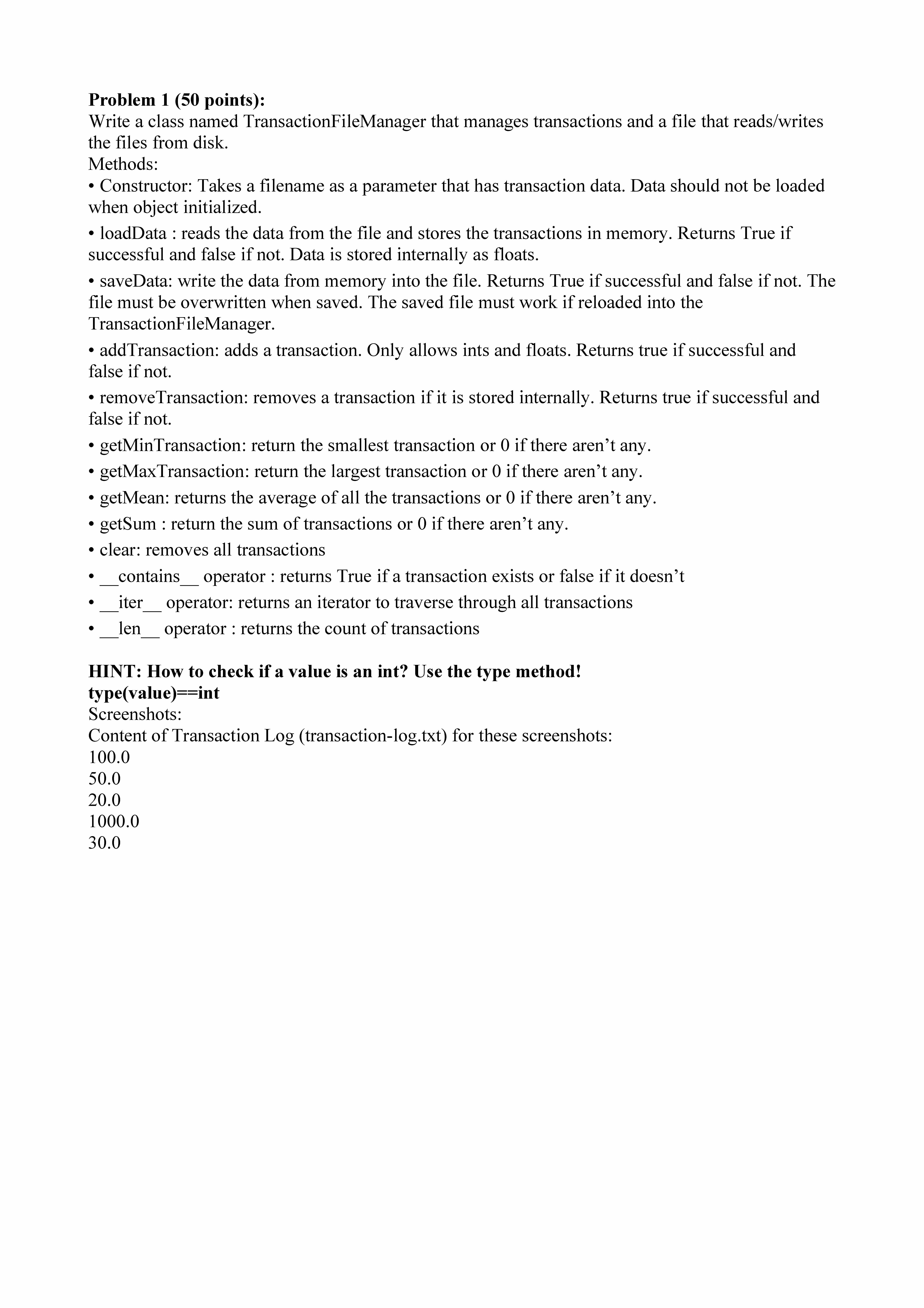 Problem 1 (50 points): Write a class named TransactionFileManager...