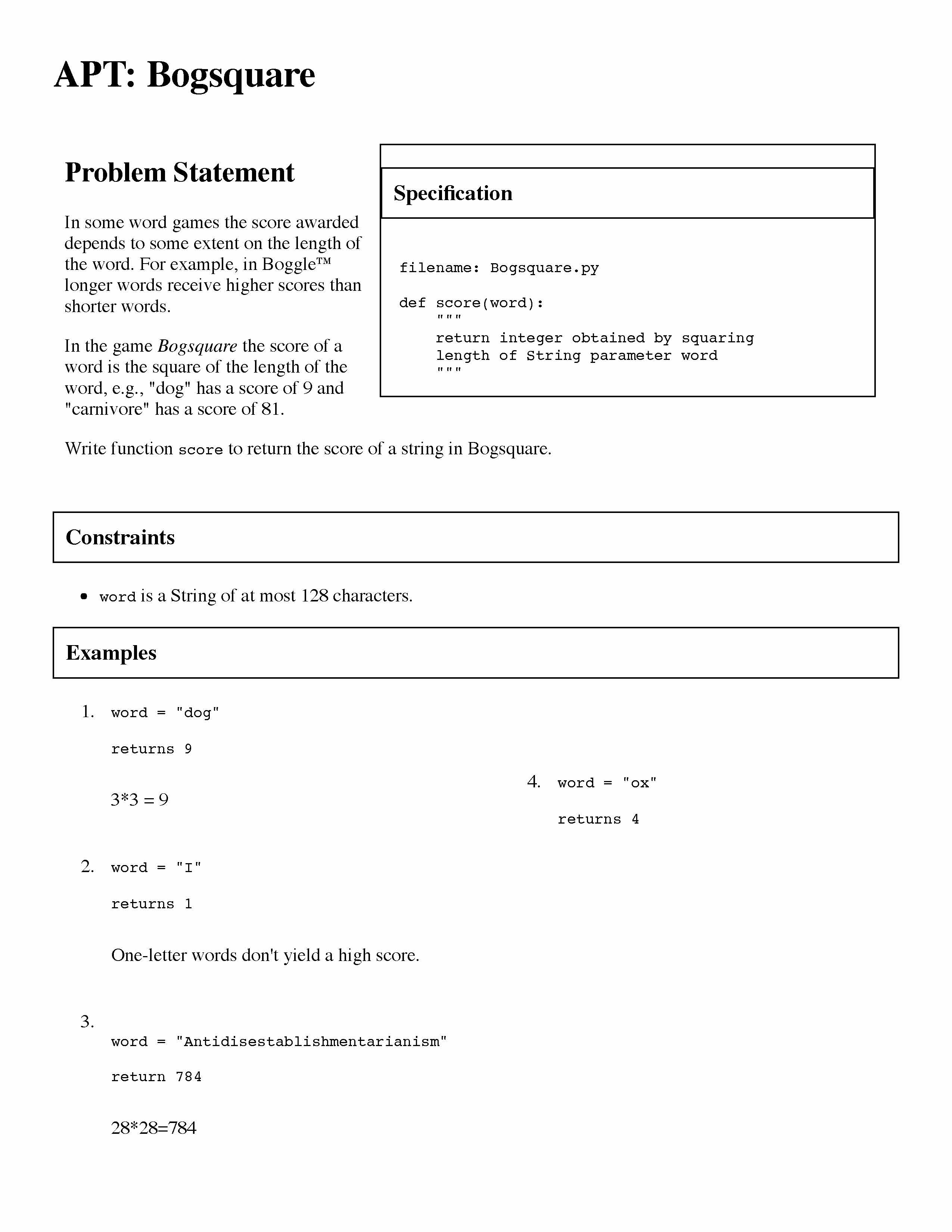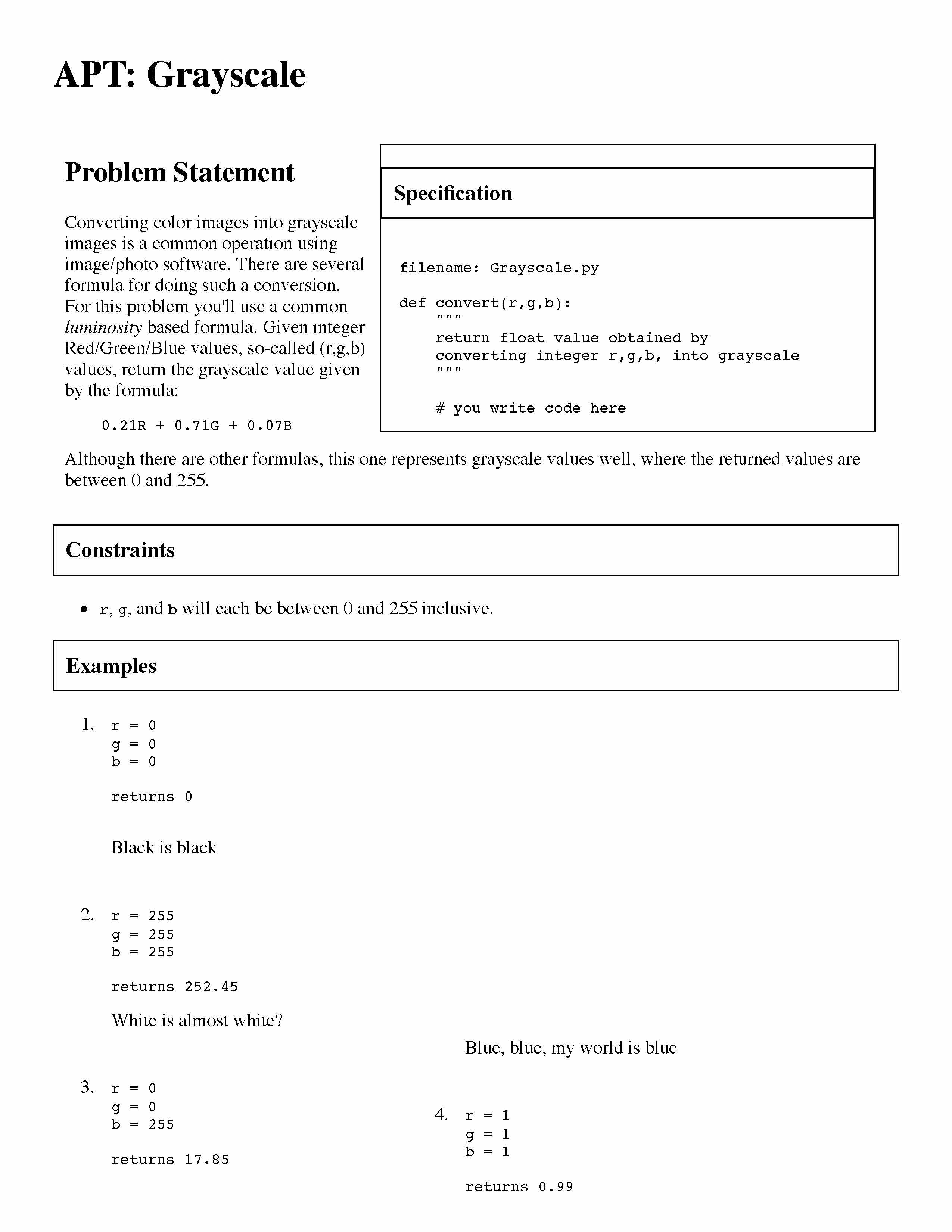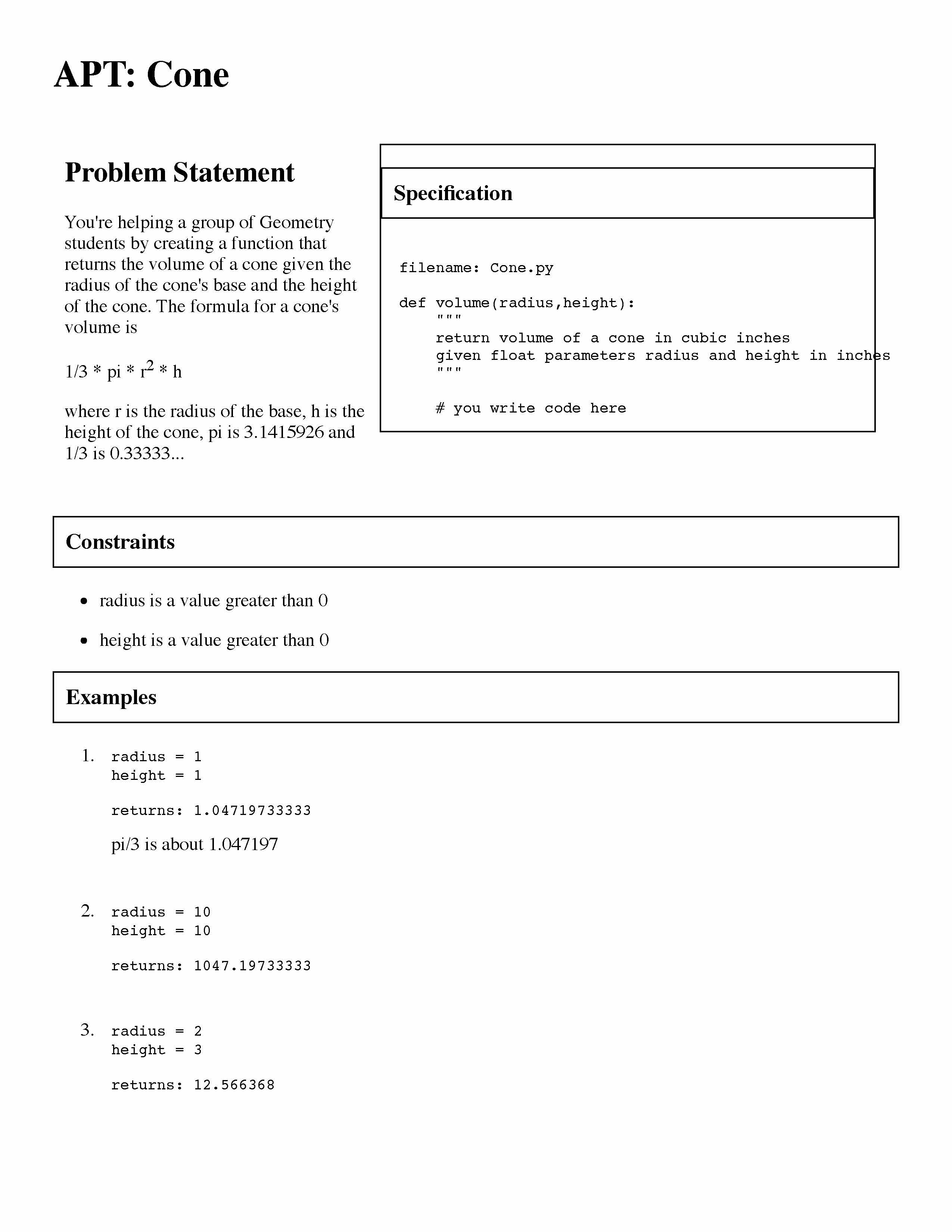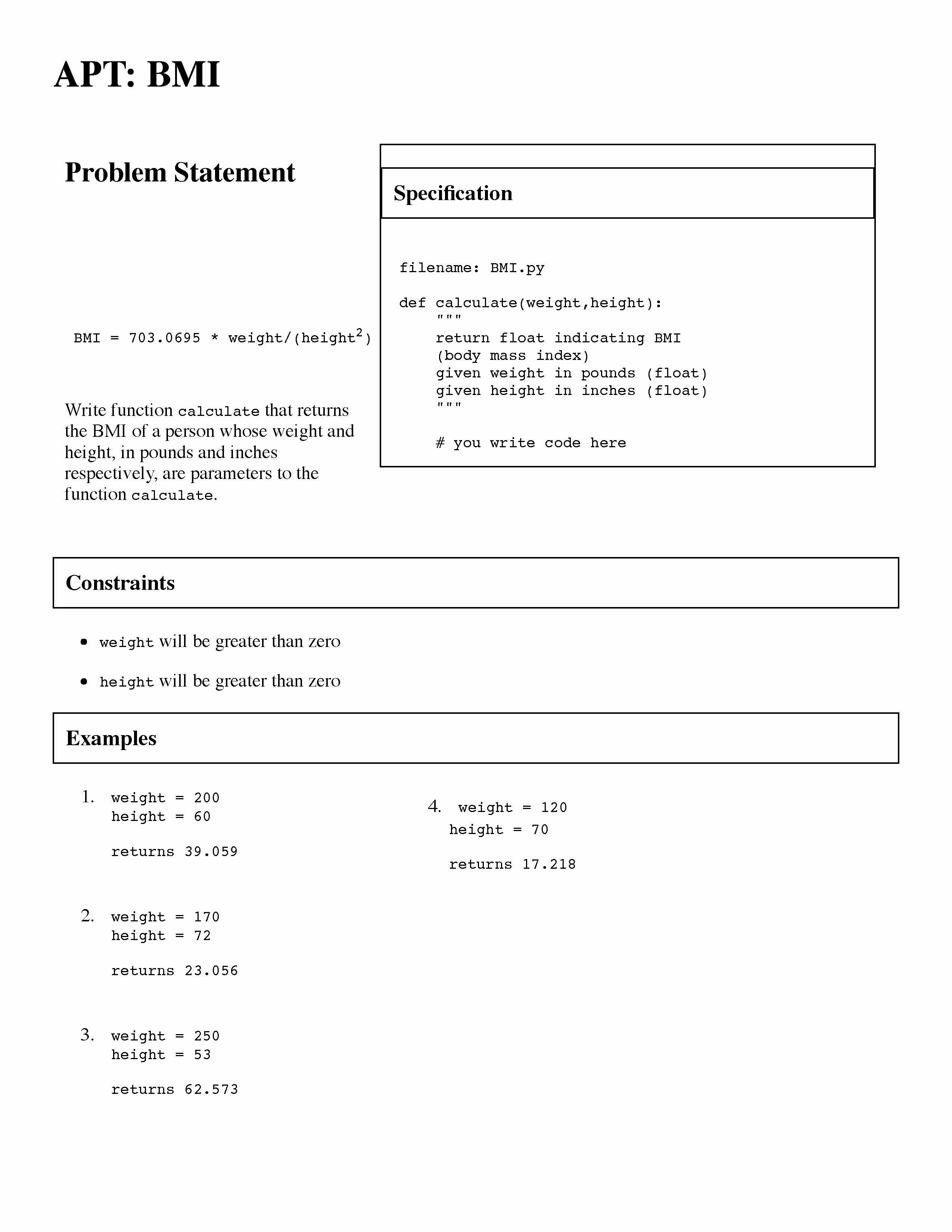 Specification filename: BMI.py def calculate(weight,height): ...