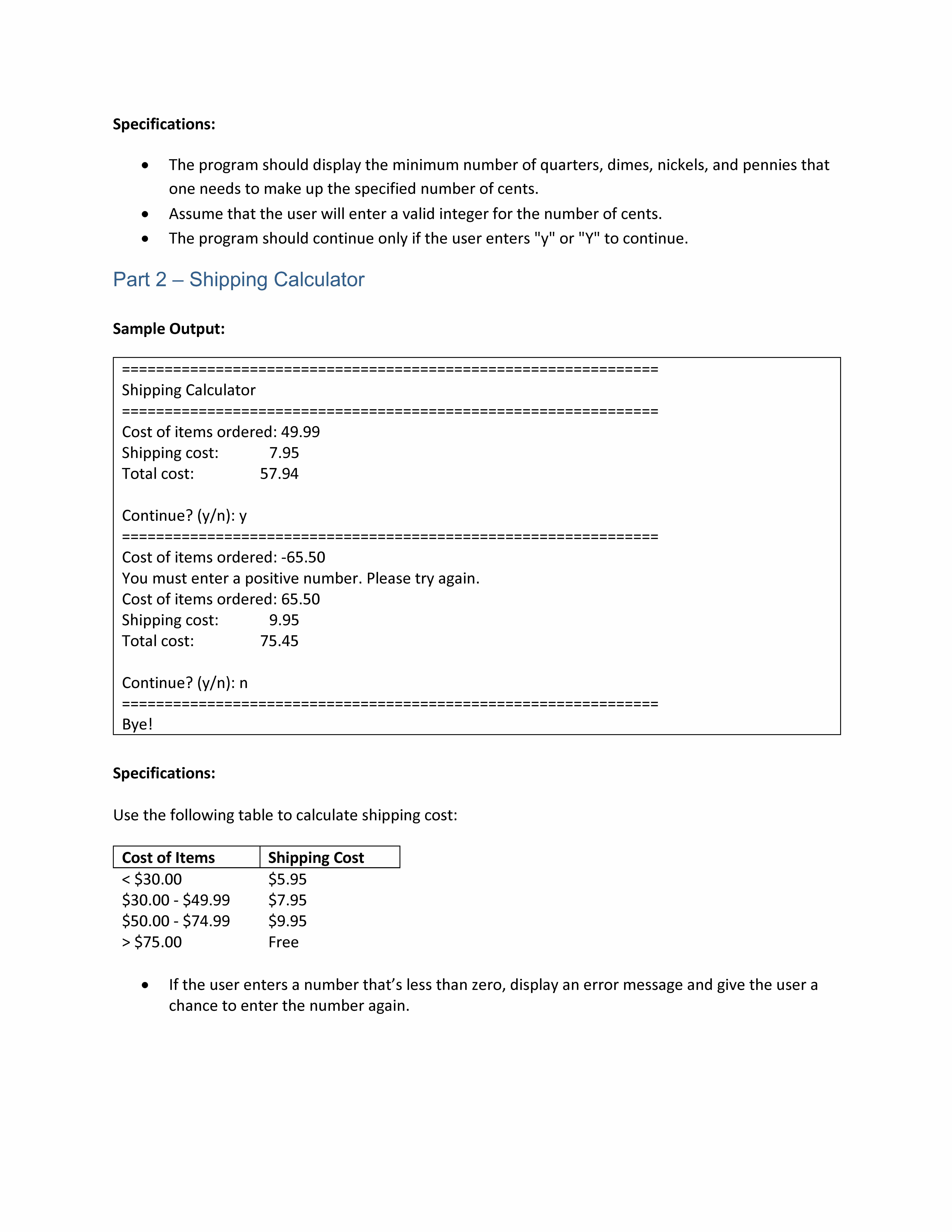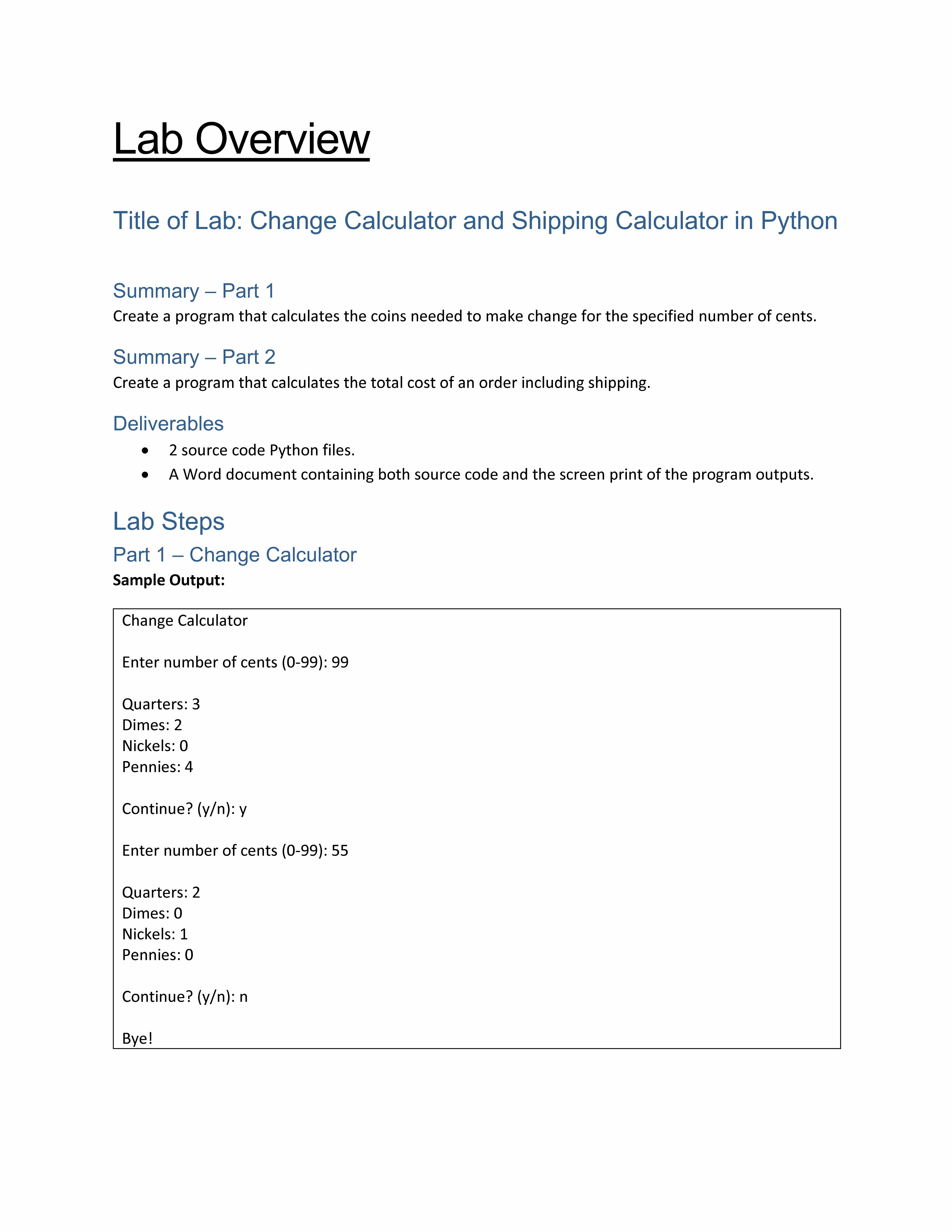 Lab Overview Title of Lab: Change Calculator and Shipping Calculat...