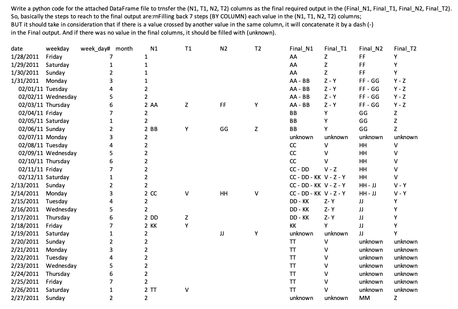 Write a python code for the attached DataFrame file to trnsfer the ...