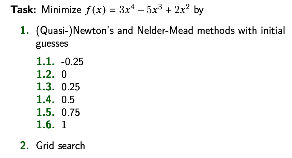 Task: Minimize f(x) = 3x4-5x - 3 + 2x2 by 1. (Quasi-) Newton's and...