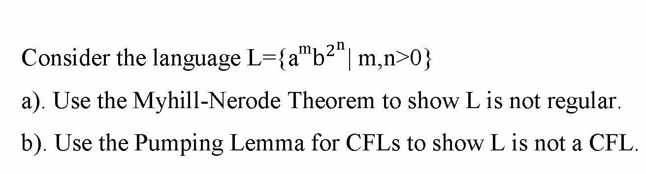 Consider the language L={am | m,n>0} a). Use the Myhill-...