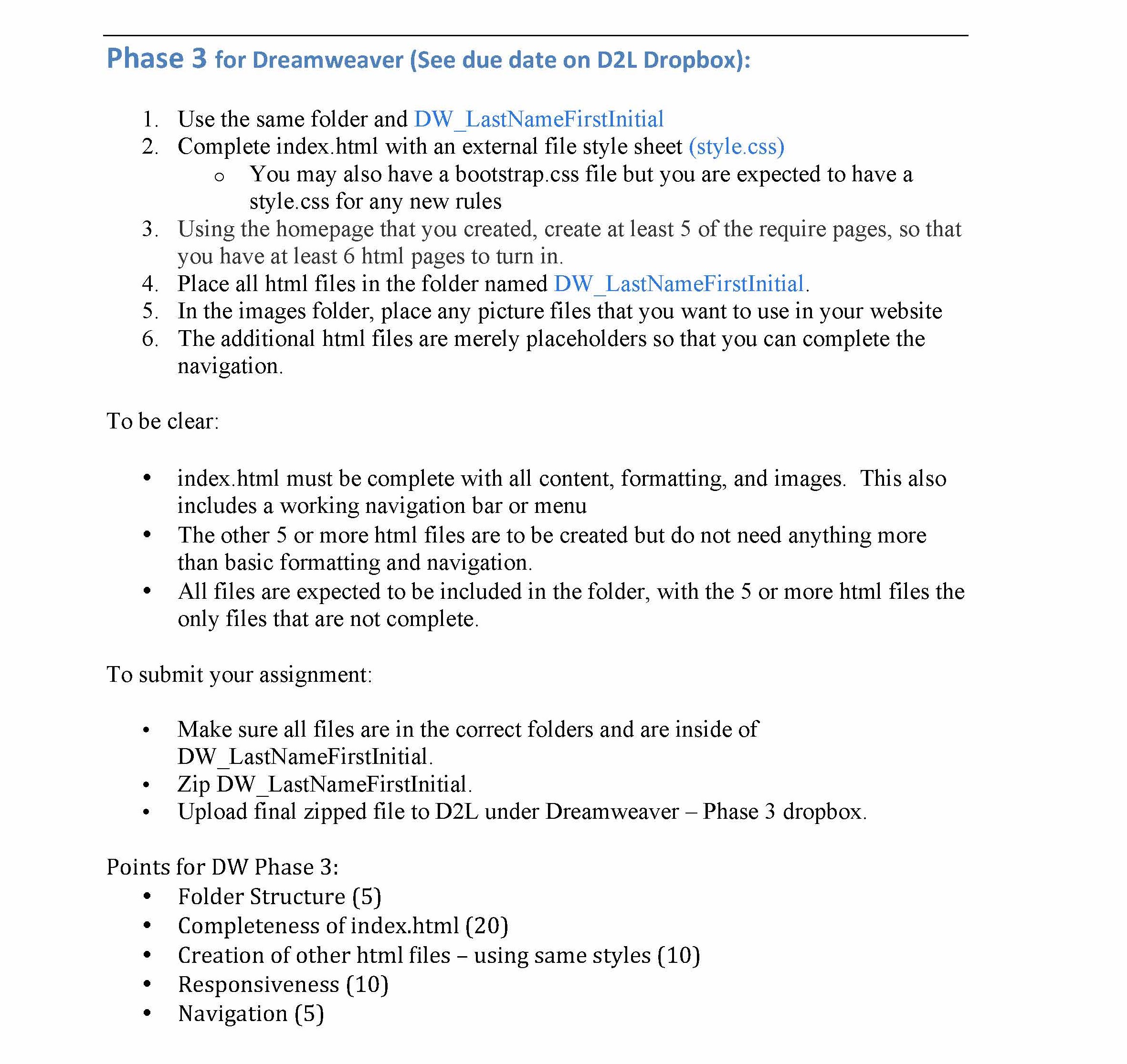 Phase 3 for Dreamweaver (See due date on D2L Dropbox): 1. Use the ...