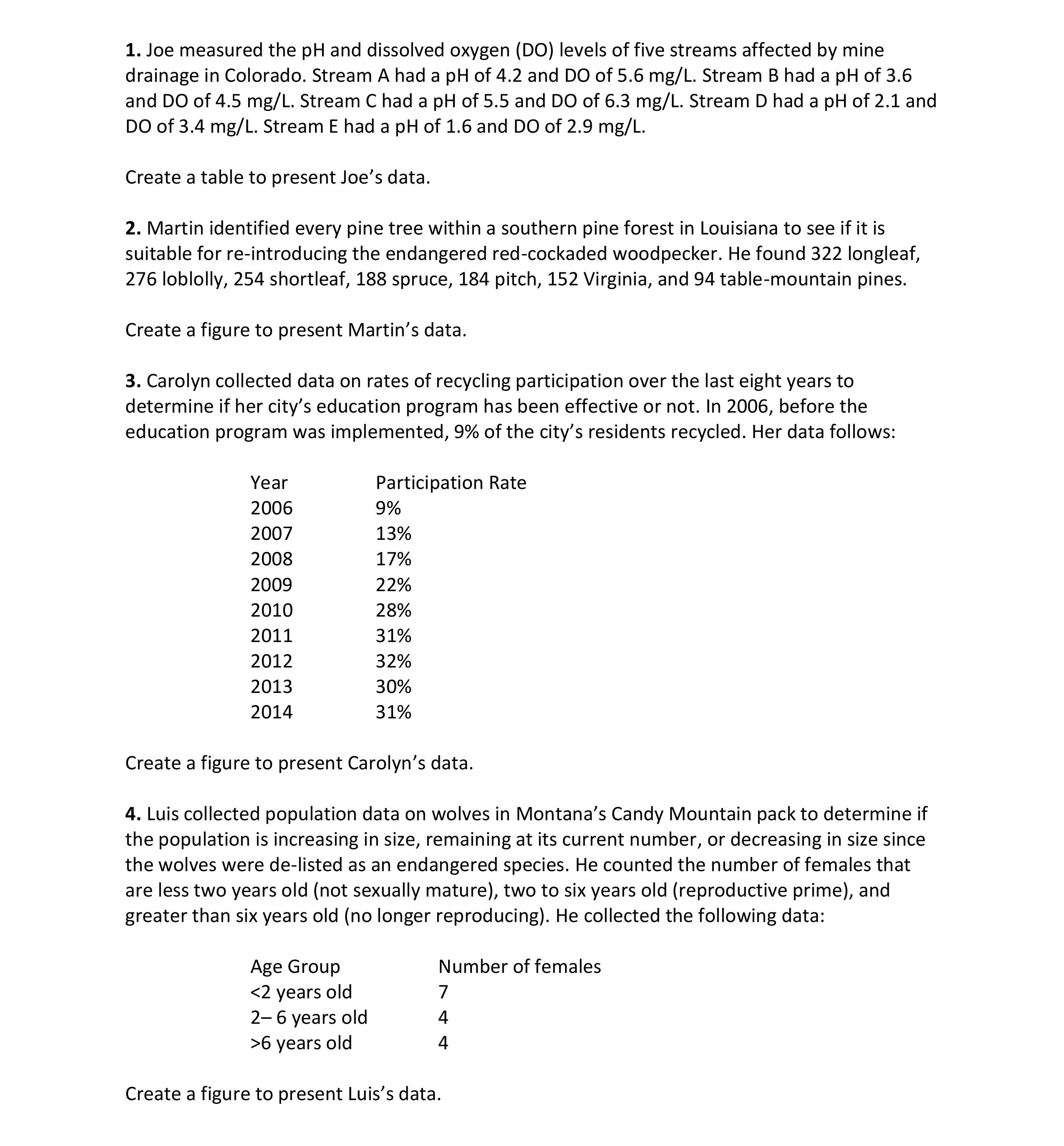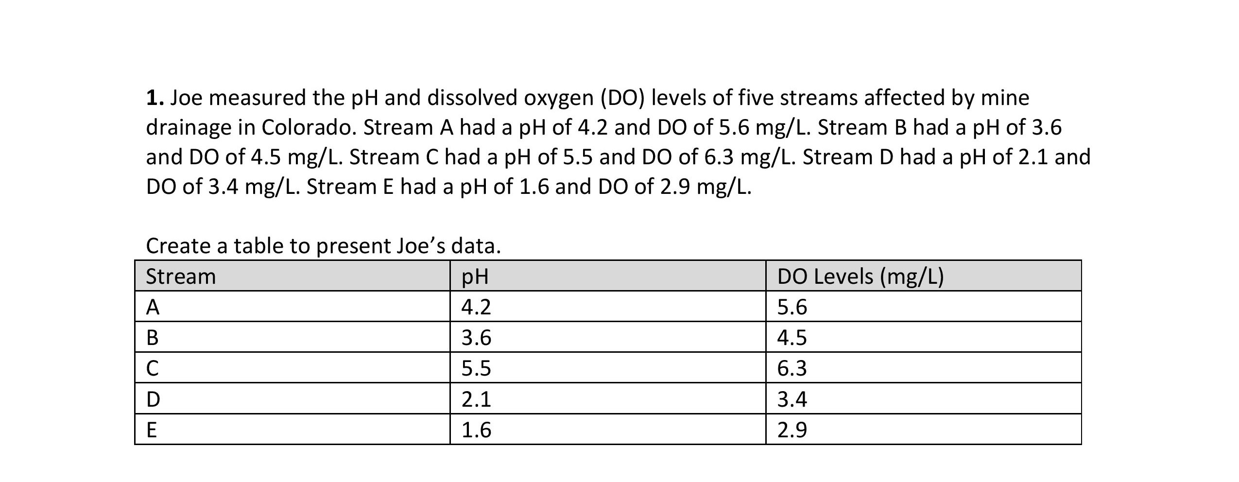 1. Joe measured the pH and dissolved oxygen (DO) levels of five str...