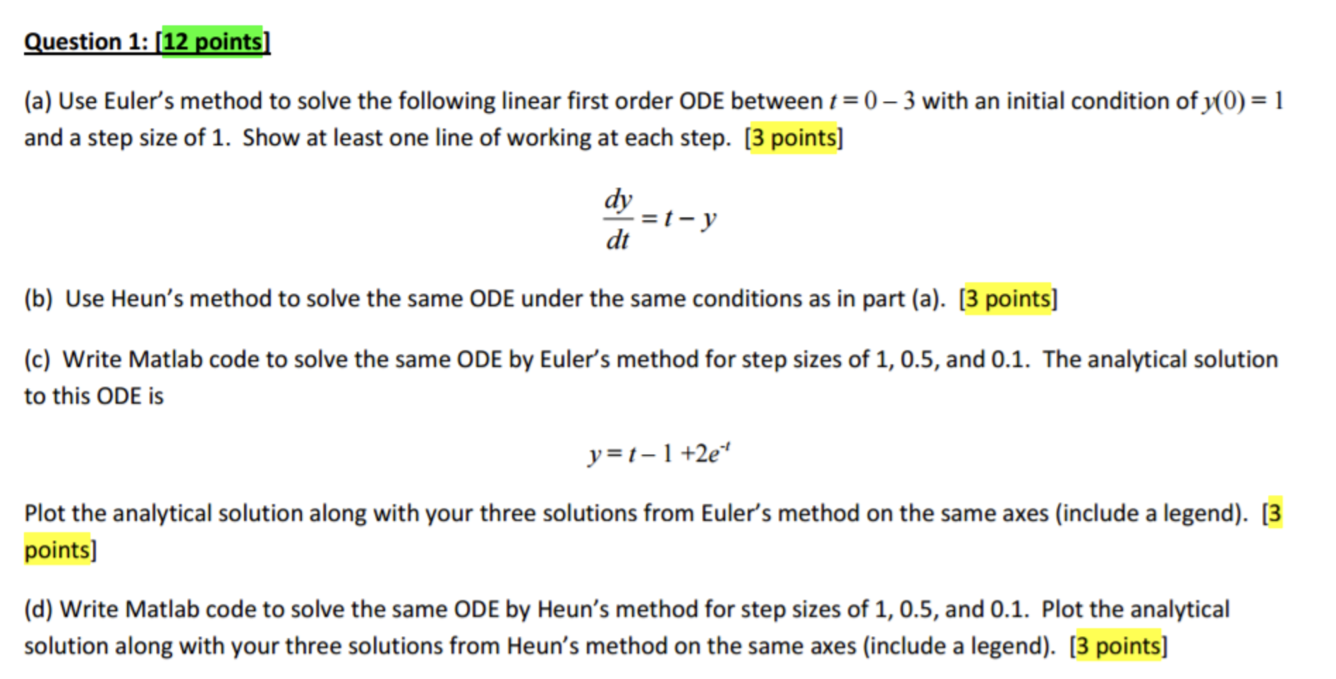 Question 1: 12 points) (a) Use Euler's method to solve the followi...