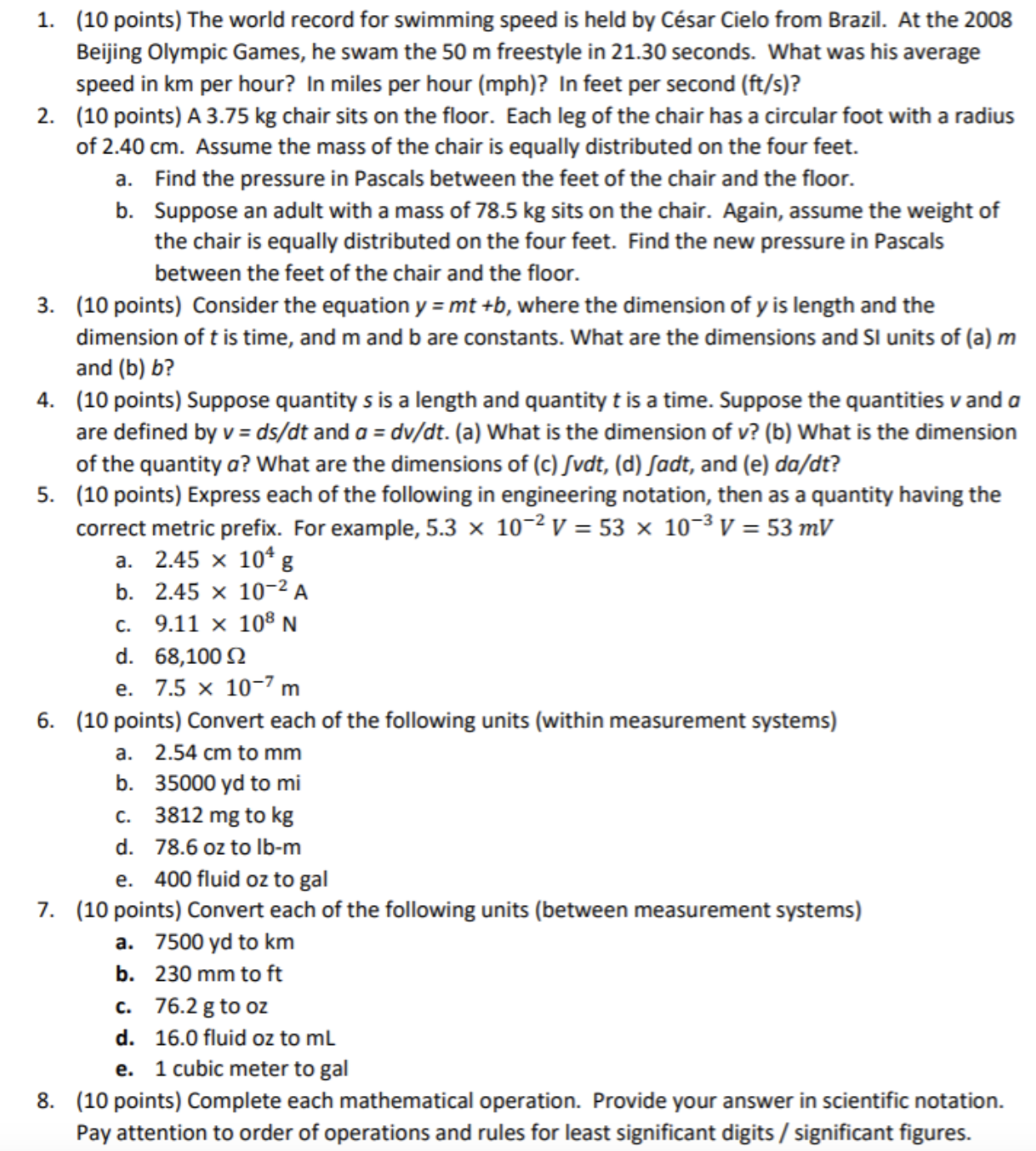 1. (10 points) The world record for swimming speed is held by Cés...