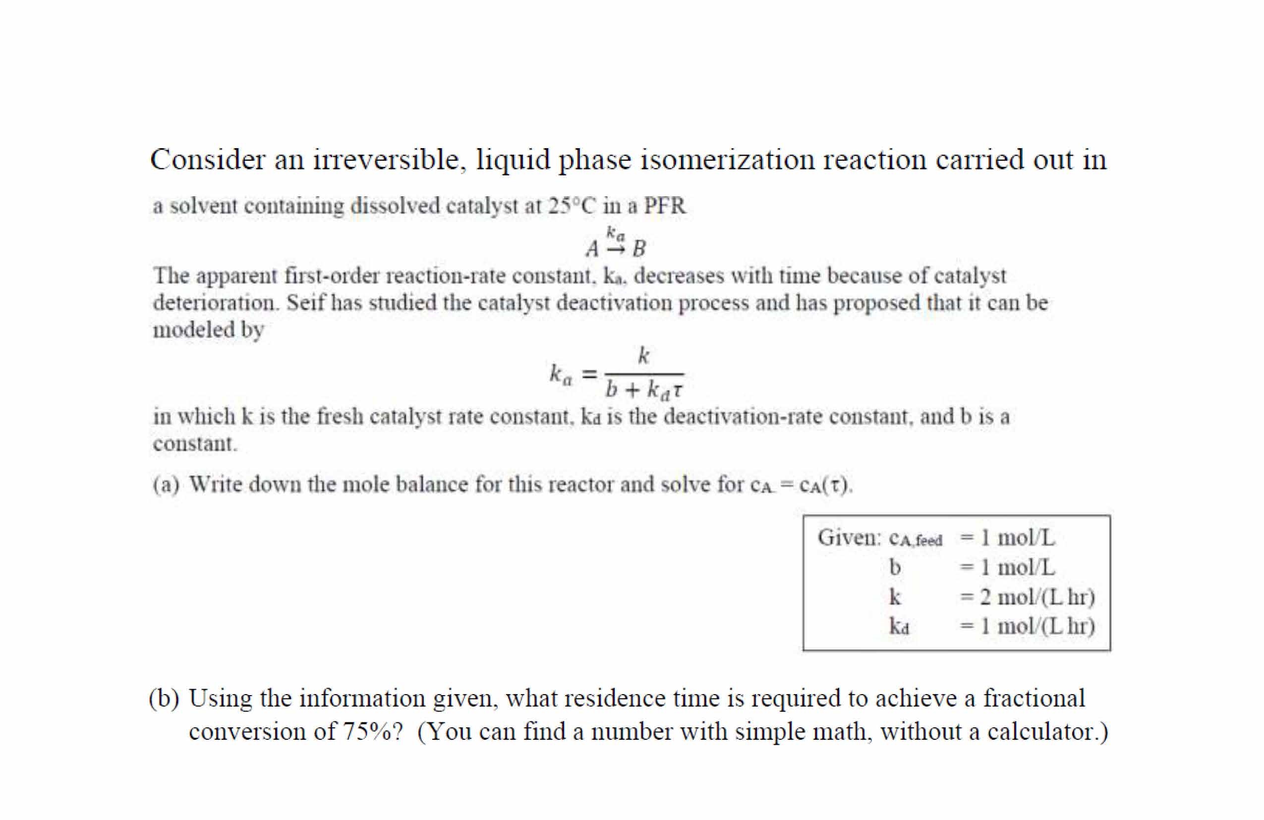 Consider an irreversible, liquid phase isomerization reaction carri...